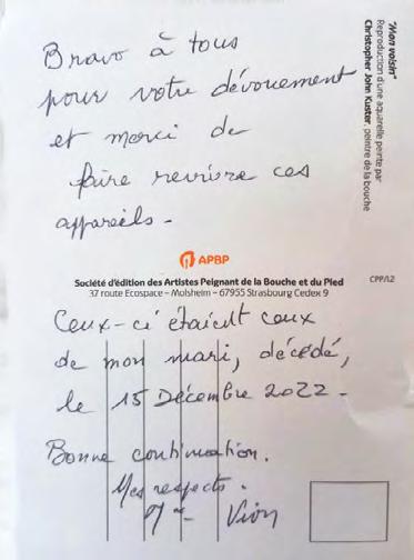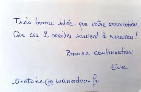 Qui dit recyclage, dit récupération des appareils auditifs. Toutes les semaines nous recevons des colis provenant de nos audioprothésistes mécènes ou directement de familles, de parents, d’enfants, de maris, de femmes… qui ont eu vent de notre action. Derrière chaque appareil reçu, il y a une histoire et parfois les donateurs nous la partage et cela nous touche beaucoup… nous mettons un point d’honneur à remercier chaque personne qui nous fait un don, c’est tellement précieux. À notre tour de partager avec vous quelques gentils mots reçus ces dernières semaines :
