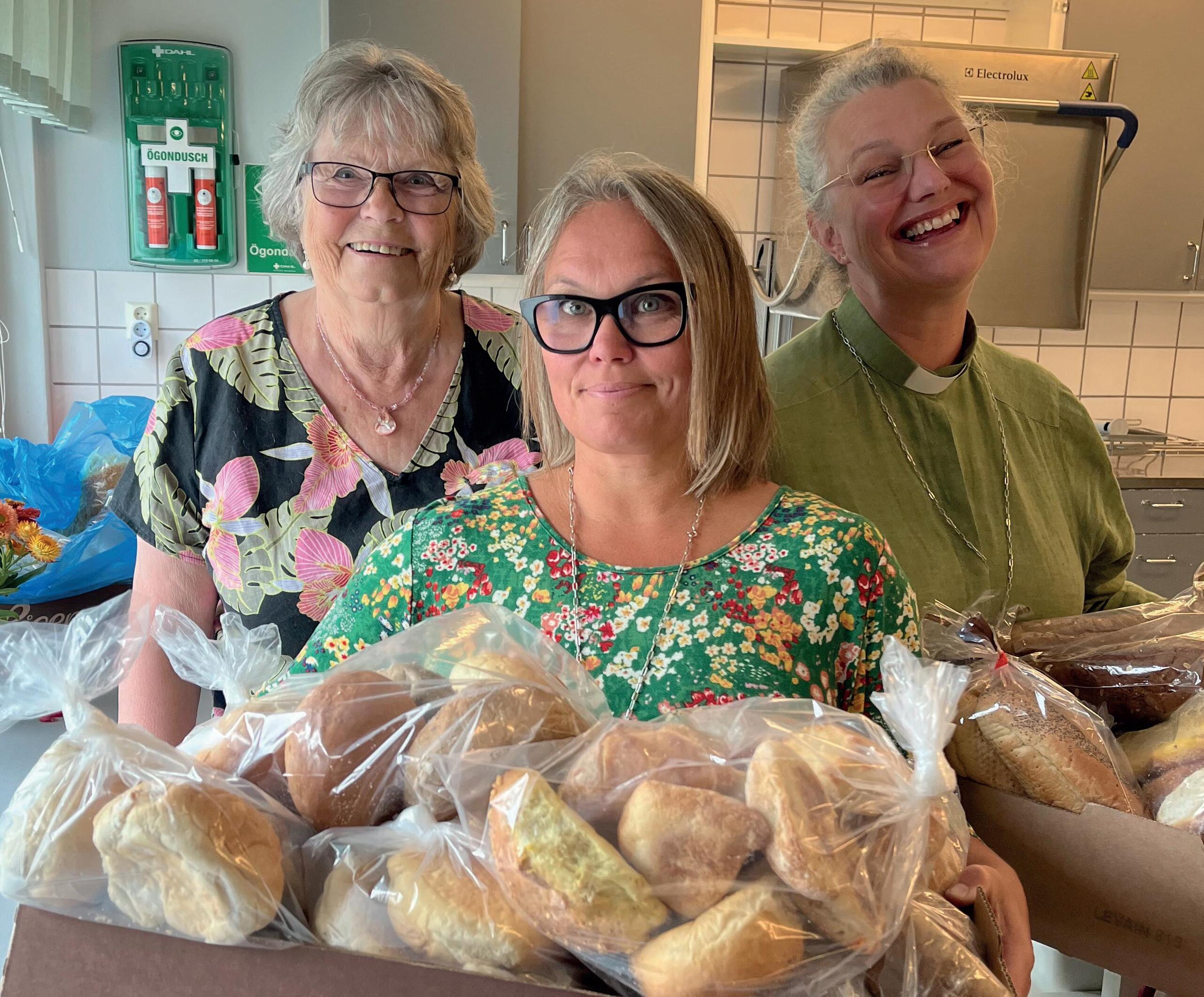 Varje vecka får Aspelands pastorat bröd från Guldkringlan i Vimmerby som ges vidare till hushåll som behöver stöd. Barbro Lundin-Karlsson, ideellt engagerad, tillsammans med diakon Emmie Davidsson och diakon Birgit Johansson.