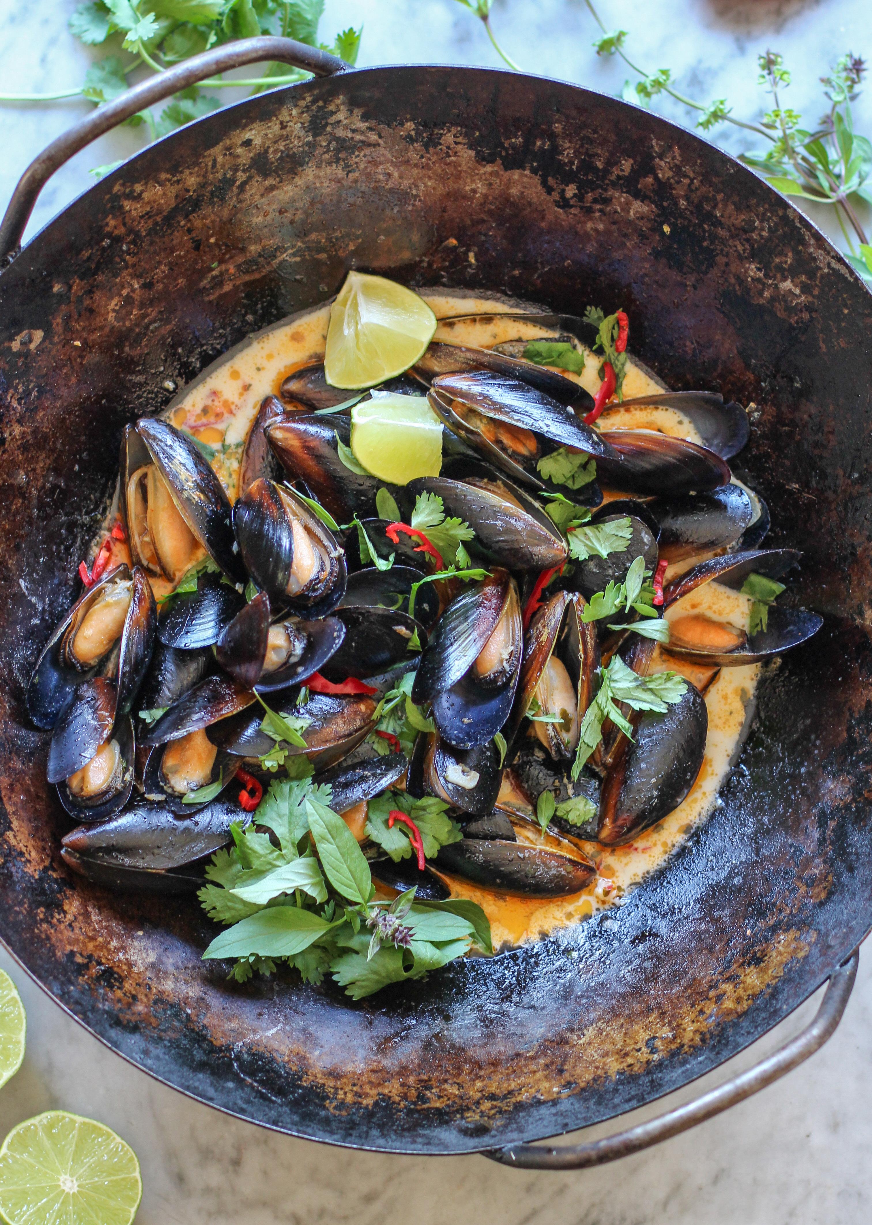 A more exotic take on moules marinière. Serve with plenty of crusty French bread to soak up all the lovely juices. Serves 4