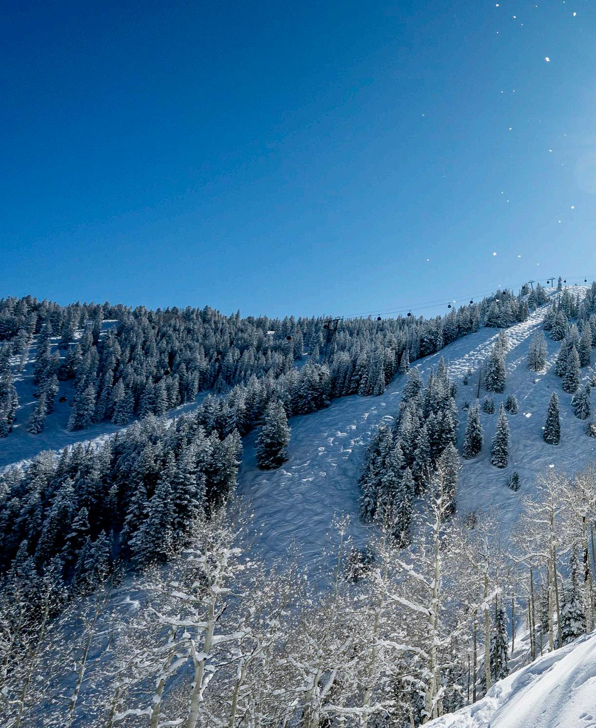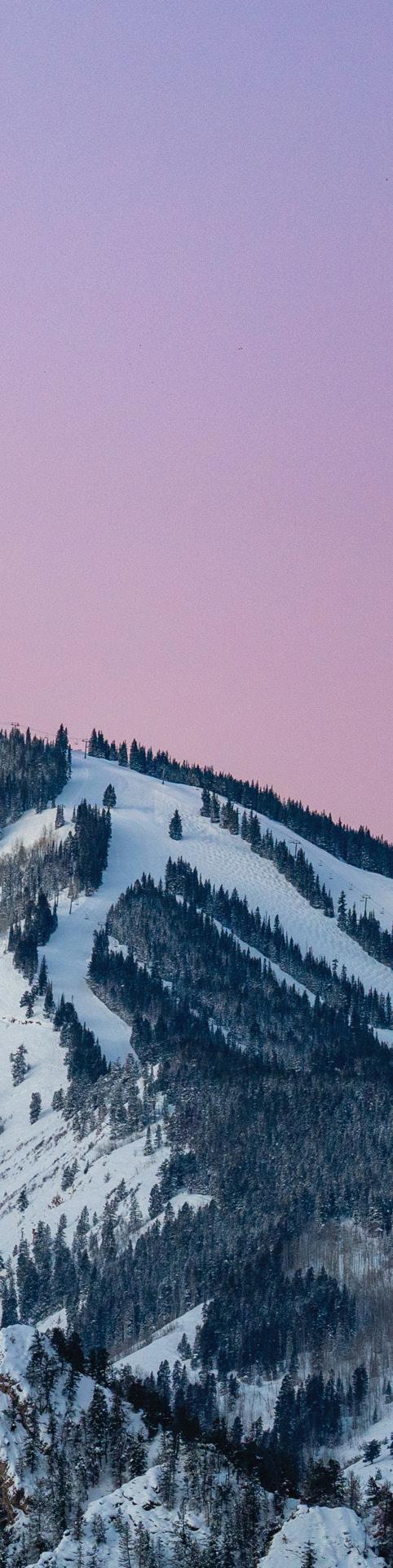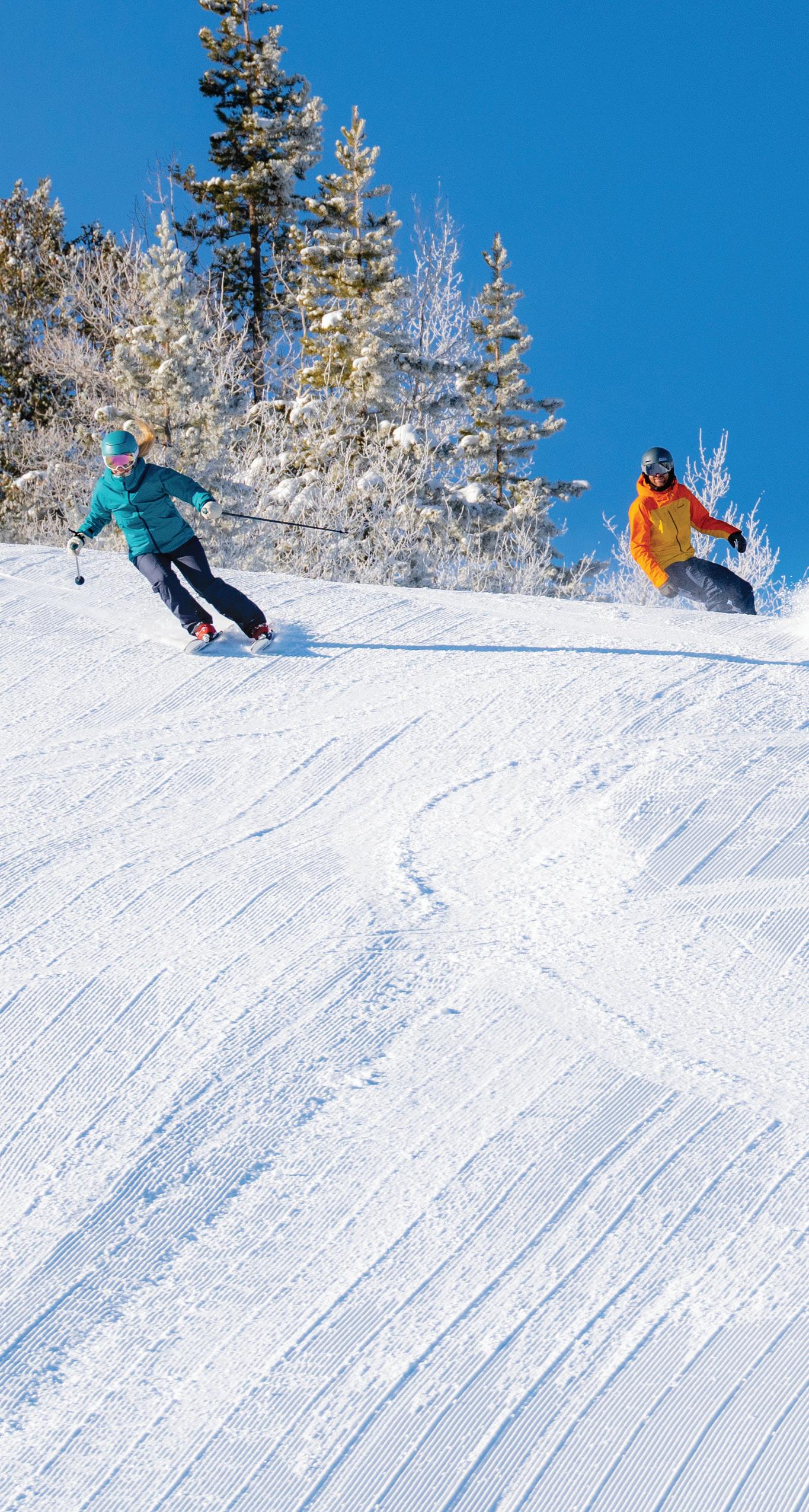 Snowmass offers the most ski-in/ski-out lodging in the area, so it’s easy to start the day at your own pace, clipping into your skis right outside your door. If you’re looking for some solo time, drop your little ones at the Treehouse Kids’ Adventure Center, a childcare facility located right at the base of the mountain catering to ages one through four and mixing indoor and onsnow play. From there, make your way up Village Express and over to the Big Burn lift. On this part of the mountain, snow lingers in the low-angle pine glades of Powerline Trees, and sweeping turns down Sneaky’s—an intermediate groomer with outstanding views—will fire up your limbs. Up for a challenge? Hanging Valley Wall provides sheer, expert lines that serve as a venue for big mountain competitions. When it’s time for lunch, Snowmass has some excellent elevated dining options, like modern Italian at Sam’s, a reimagination of Alsatian home cooking at Alpin Room, and Lynn Britt Cabin, with a rustic feel inside and lively après outside. When the day is done, reconvene with your whole group to enjoy beers or cocktails at locally-loved bars like Venga Venga or Ranger Station in Snowmass Mall, or gather at the Collective in Base Village for drinks and activities.