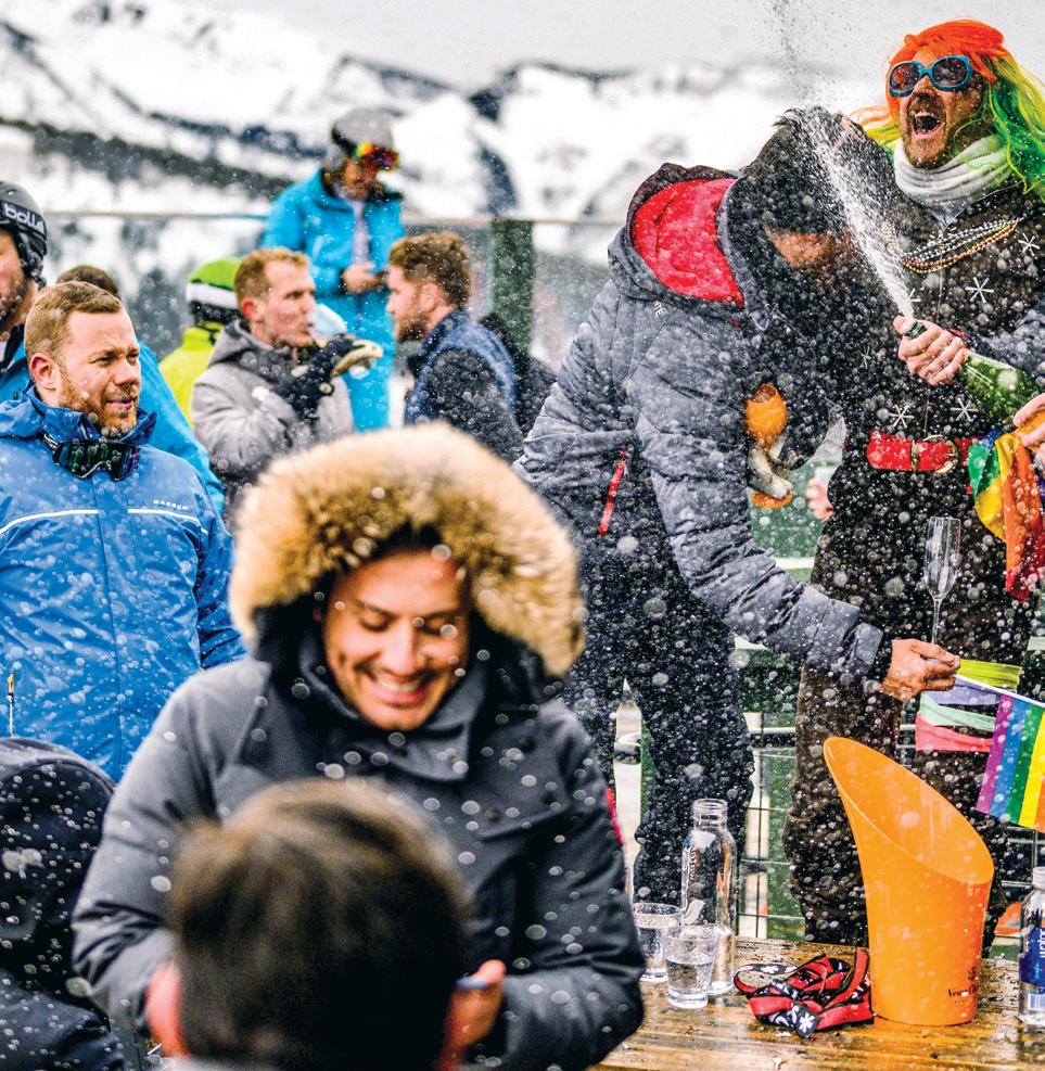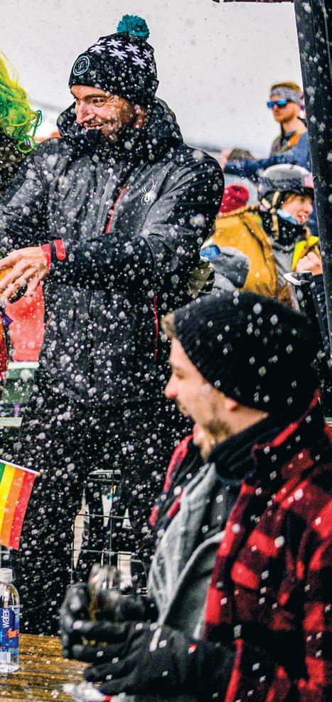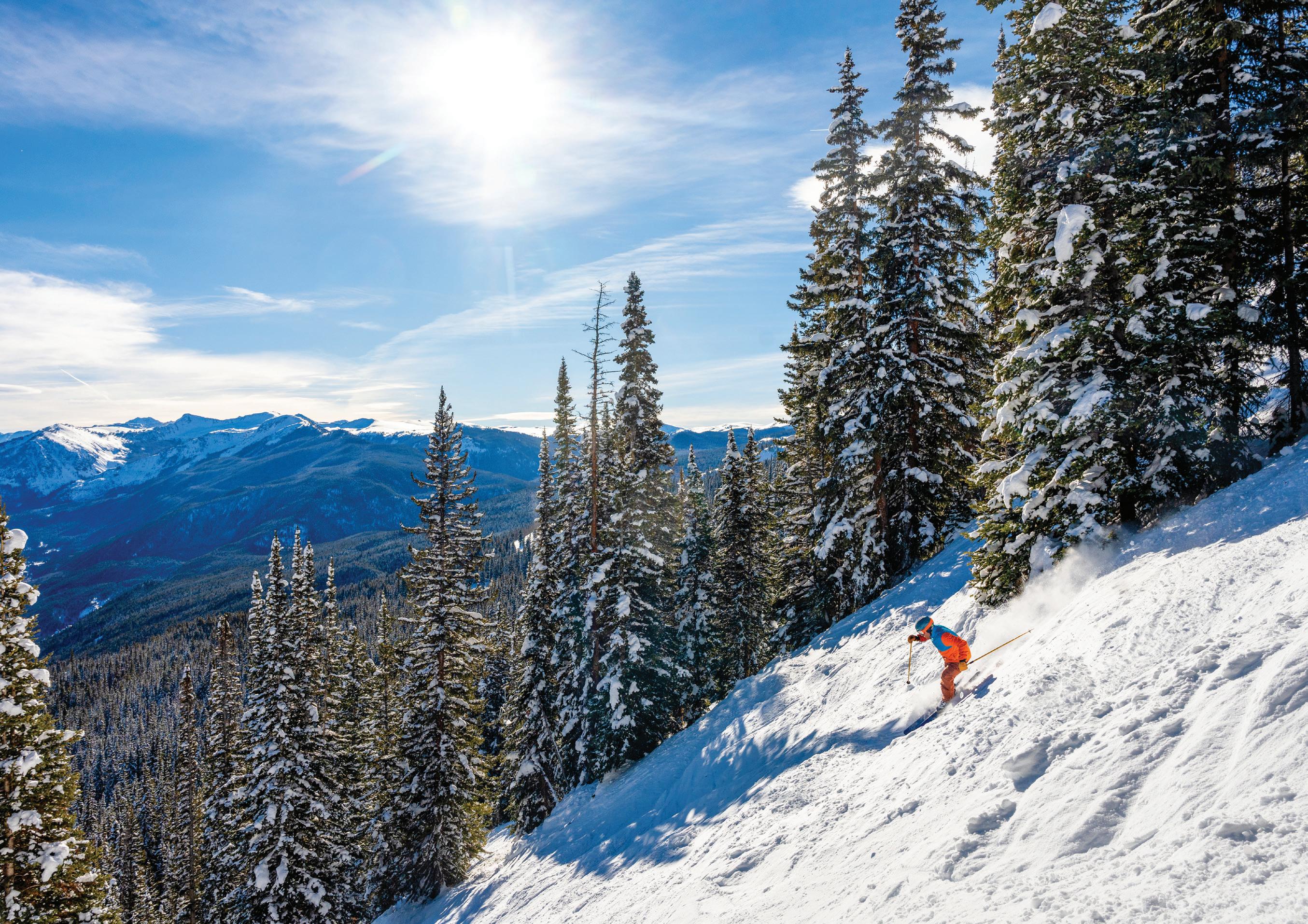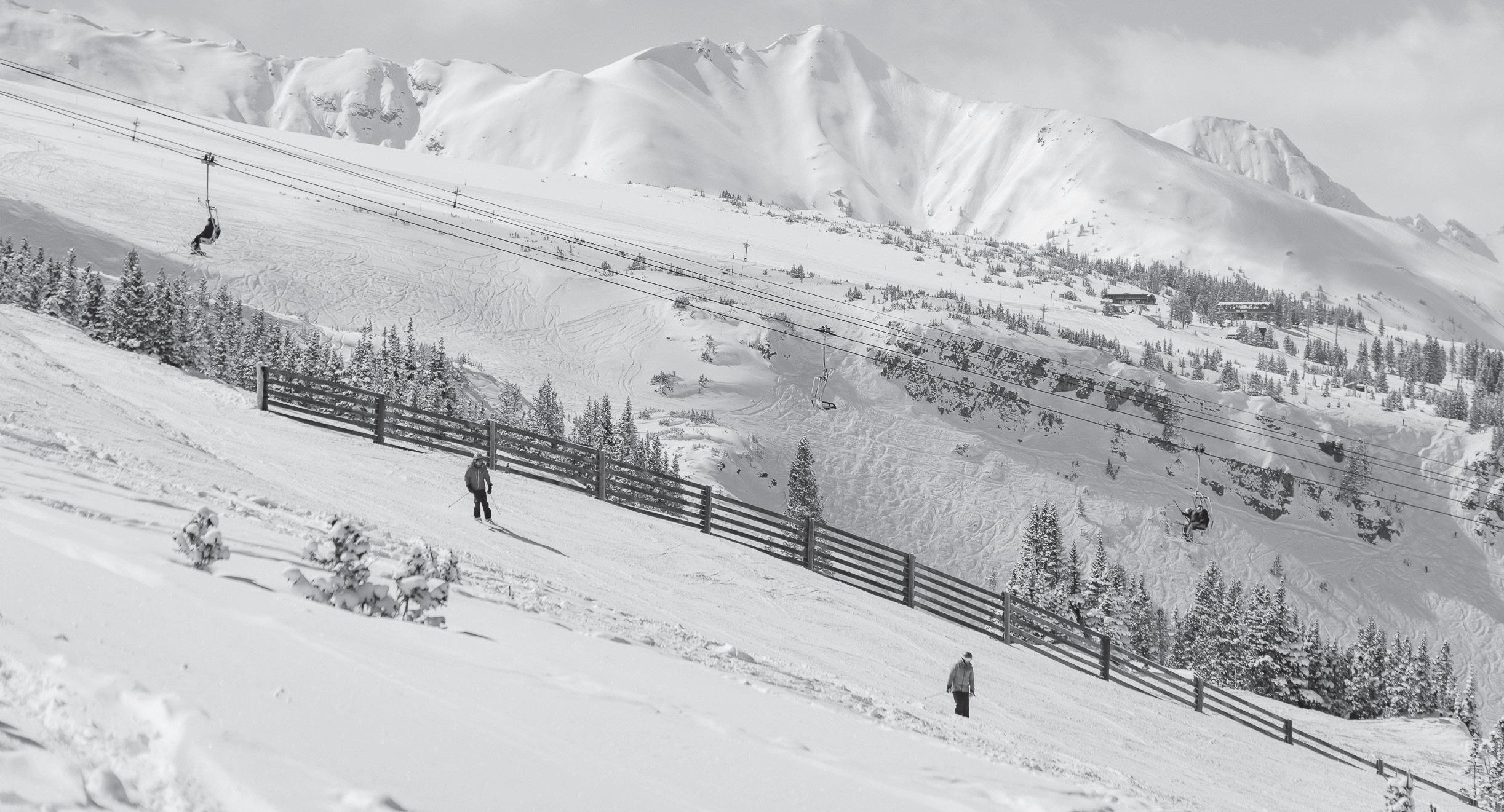 Snowmass offers the most ski-in/ski-out lodging in the area, so it’s easy to start the day at your own pace, clipping into your skis right outside your door. If you’re looking for some solo time, drop your little ones at the Treehouse Kids’ Adventure Center, a childcare facility located right at the base of the mountain catering to ages one through four and mixing indoor and onsnow play. From there, make your way up Village Express and over to the Big Burn lift. On this part of the mountain, snow lingers in the low-angle pine glades of Powerline Trees, and sweeping turns down Sneaky’s—an intermediate groomer with outstanding views—will fire up your limbs. Up for a challenge? Hanging Valley Wall provides sheer, expert lines that serve as a venue for big mountain competitions. When it’s time for lunch, Snowmass has some excellent elevated dining options, like modern Italian at Sam’s, a reimagination of Alsatian home cooking at Alpin Room, and Lynn Britt Cabin, with a rustic feel inside and lively après outside. When the day is done, reconvene with your whole group to enjoy beers or cocktails at locally-loved bars like Venga Venga or Ranger Station in Snowmass Mall, or gather at the Collective in Base Village for drinks and activities.