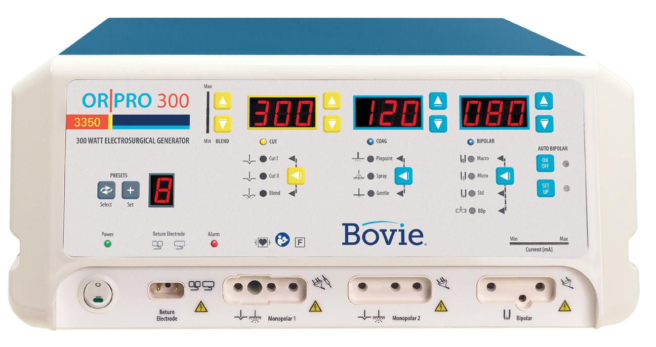 The Bovie® 3350-V offers 300 watts of power to facilitate large animal surgical procedures. This innovative, energy-based device offers 13 modes of surgical energy delivery. With the auto-bipolar mode, energy can be automatically delivered in 1-5 seconds without the need to use a footswitch. Unique to the Bovie® 3350-V is the Bovie Bipolar (BBP) mode with pulsing bipolar for tissue fusion to help control bleeding.