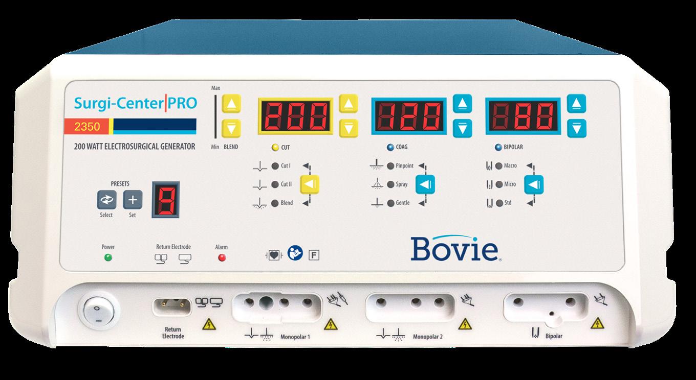 The Bovie® 2350-V, Surgi-Center | PRO Electrosurgical Generator is the premier electrosurgery unit from Bovie for animal health procedures. In addition to the capabilities included with the Bovie® 1250S-V, the Bovie® 2350-V offers more electrosurgery modalities, including four (4) blend settings, allowing veterinarians to deliver safe and precise energy applications during more complex surgical procedures. Dual monopolar ports can be activated simultaneously in Fulguration to control bleeding or treat superficial tissue. The dual ports can also be utilized separately in different modes. The Cut II specialized laparoscopic mode is engineered with a lower voltage than competitive units, reducing the risk of alternate site burns and increasing patient safety during minimally invasive procedures. The Bovie® 2350-V was engineered with the technology and safety of more expensive electrosurgical units, but economically priced for the animal health practice.