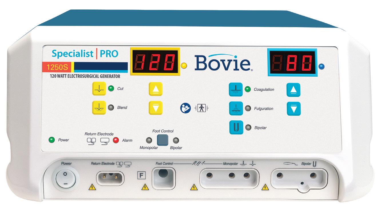 The Surgi-Center | PRO state-of-the-art technology includes Bovie NEM™ (Neutral Electrode Monitoring) pad sensing, which monitors return electrode for optimum patient protection, Bovie FDFS™ (Fast Digital Feedback System), which constantly measures the voltage and current and adjusts the power as appropriate, and Bovie DED™ (Digital Error Detection), which monitors all of the generator’s functions to ensure constant safety for the patient, doctor, and OR staff. A four-year warranty backs the unit.