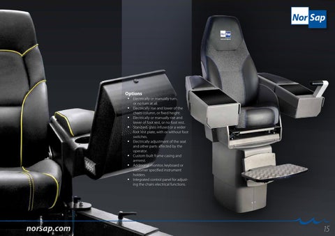 Electrically or manually turn, or no turn at all. Electrically rise and lower of the chairs column, or fixed height. Electrically or manually rise and lower of foot rest, or no foot rest. Standard, glass infused or a wider foot rest plate, with or without foot switches. Electrically adjustment of the seat and other parts affected by the operator. Custom built frame casing and armrest. Additional monitor, keyboard or customer specified instrument holders. Integrated control panel for adjusting the chairs electrical functions.