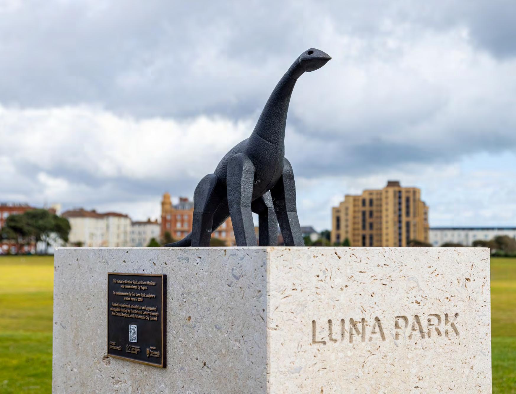 I stand for language. I speak for history. I shout for truth. Heather Peak and Ivan Morison Conceived as a long-lasting tribute to Luna Park (2010), the artist’s 16m high artwork, affectionately known by local residents as ‘The Southsea Dinosaur’ which tragically burned down. The new piece of public art consists of a bronze sculpture of the original dinosaur, atop a fossil Portland stone plinth totalling 1.4m. A plaque on the plinth enables visitors to connect to an Augmented Reality experience on their smartphones - revealing a full-size digital rendering of the original artwork at its original position on Southsea Common. This work was commissioned by Aspex with pledges from 147 individuals, the majority from Portsmouth, through Crowdfunder, Portsmouth City Council Community Infrastructure Levy and support using public funding from the National Lottery through Arts Council England, along with support in kind from Brymor, JLR Services and Portsmouth City Council.
