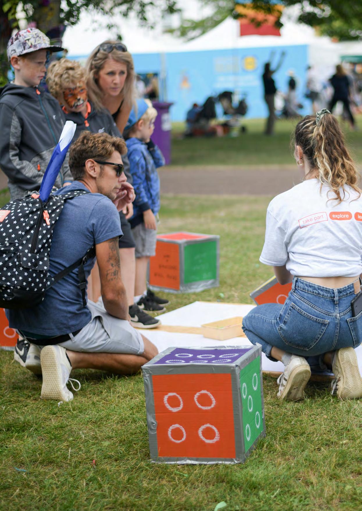 The lifting of Covid-19 restrictions meant that we were able to recommence our offsite work in the community, attending the Victoria Park Community Fair in July 2021. This was our first offsite appearance in the Mobile Art Studio since the pandemic began. At this event, and for our return to the Victorious Festival Kids Arena, we delivered dinosaur inspired participatory activities for children and young people, increasing awareness of the forthcoming tribute to Luna Park. The dinosaur theme was also carried through shop stock at Victorious and the We Create market.