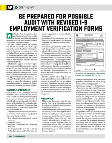 The Form I-9 has been revised. Employers are to use the new form as of Jan. 22, 2017. • Train your managers on what constitutes proper documentation and how to recognize if it is “reasonably genuine.” • Educate your managers on the importance of asking for the right identifying documents from the lists, A, B and C, of acceptable identifying documents. Asking for too many may expose you to claims of discrimination and asking for too few may result in an incomplete Form I-9. Also, be aware of what you can and cannot ask for. For instance, providing a Social Security number on Form I-9 is voluntary for all employees unless you are an employer participating in the USCIS E-Verify program. • Complete the Form I-9 in a timely manner. Forms must be completed within three (3) days of the employee’s first day of work, including the employee completing section one, providing the identifying documents and having those documents verified. If re-verification is required, employers must have a system to track and update the employee’s information and supporting documentation.