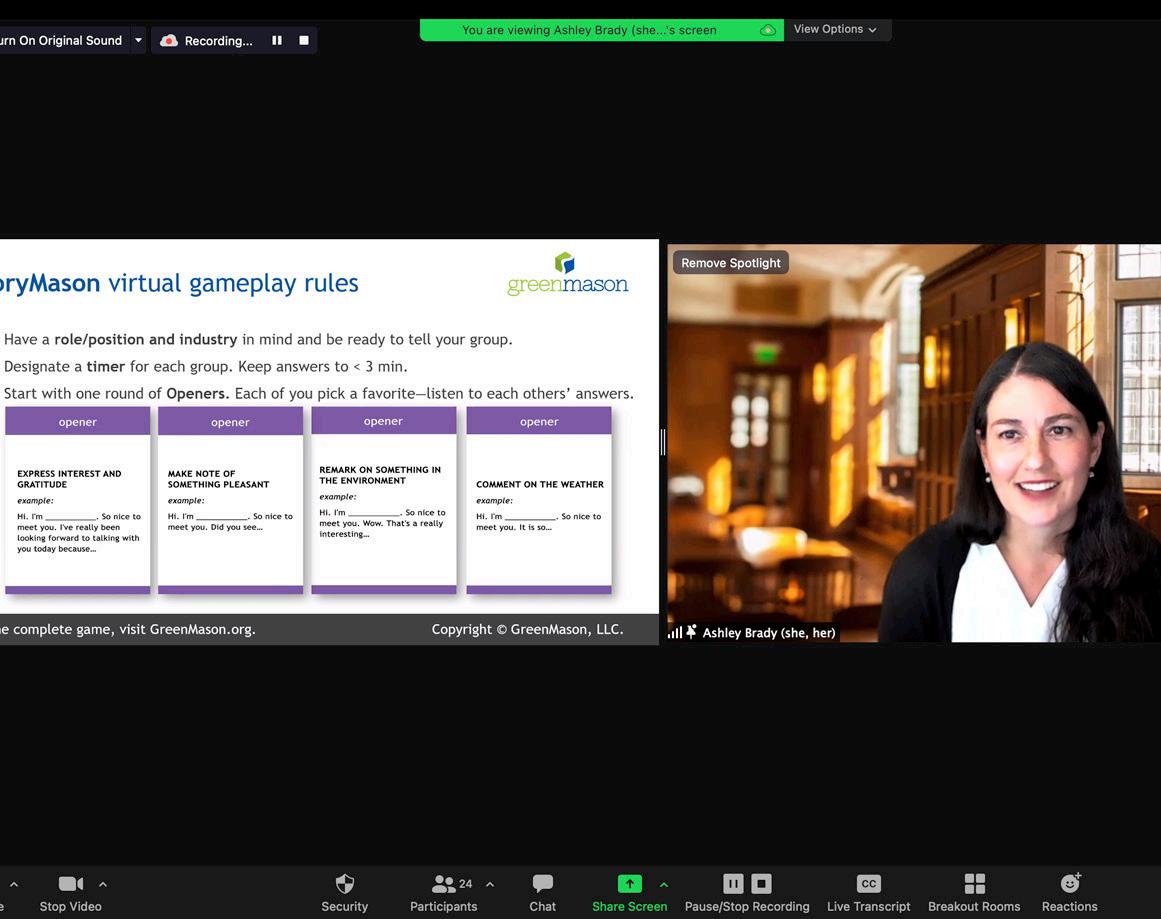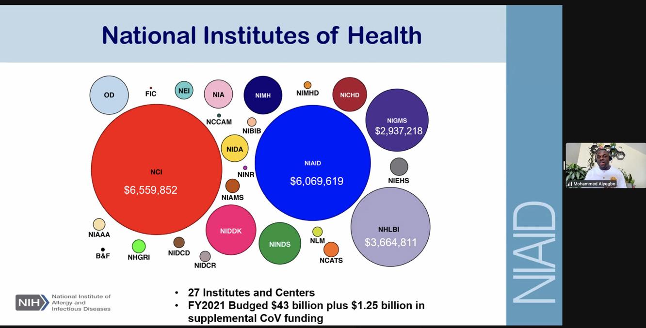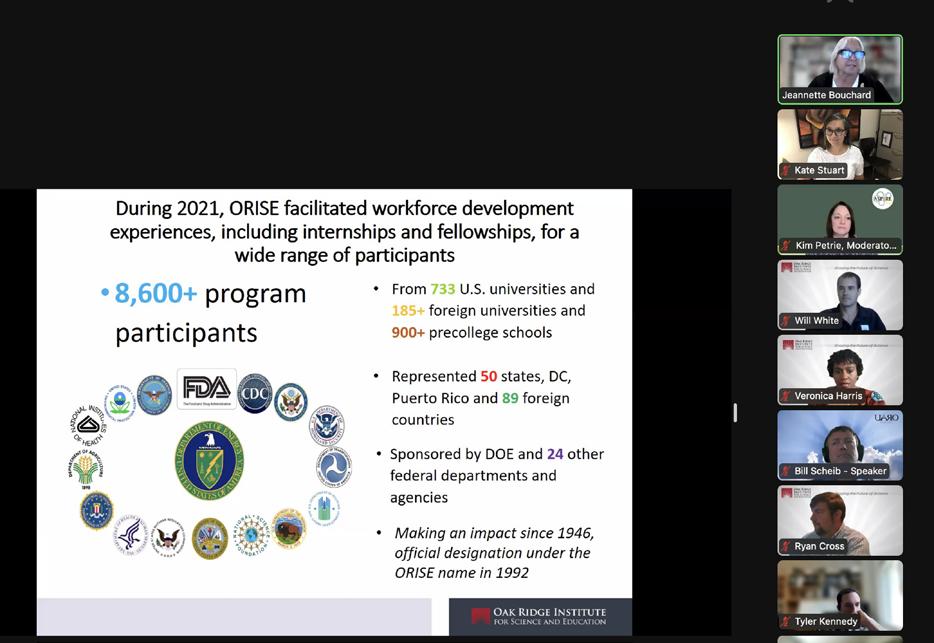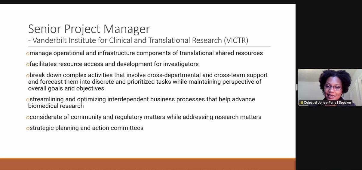 Top, keynote speaker and alumnus Larry Thompson, PhD, delivers opening remarks at the 2022 Mock Interview Day. Bottom, Pfizer employees discuss interviewing strategies and answer questions in breakout rooms.The ASPIRE Program maintains many relationships with external graduate level career development organizations at the local and national level: