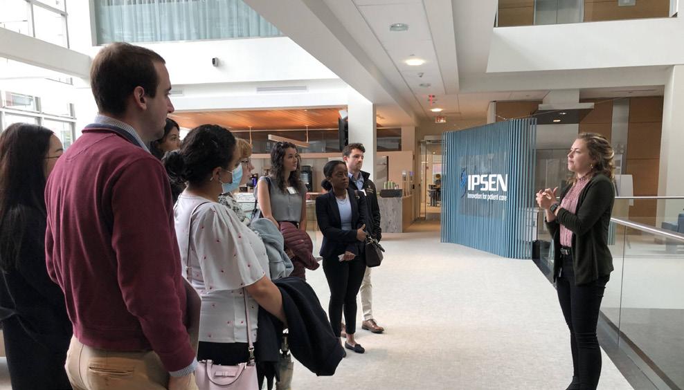 learning about some of the infrastructure that exists to support the biotech and pharma ecosystem in the area. We met with the site director for a tour of the Ipsen Innovation Center Biolabs, which acts as an incubator space for biotech startups. A company will pay rent for bench and office space, which includes other privileges like shared equipment and resources and networking opportunities with investors. It was fascinating to see the logos of all the companies currently housed in the center and the “graduated” companies who have moved on to larger spaces that are all displayed on the walls outside the lab. After learning about opportunities for new biotech companies to secure lab space and support, we visited the Massachusetts Biotechnology Council or “Mass Bio”, whose mission is to advocate for and grow the life sciences industry in the state. Mass Bio provides opportunities to become involved in the biotech community no matter your formal training. They host education and outreach programs, plan conferences and networking events, and work with policy makers to ensure the health of the biotech community.