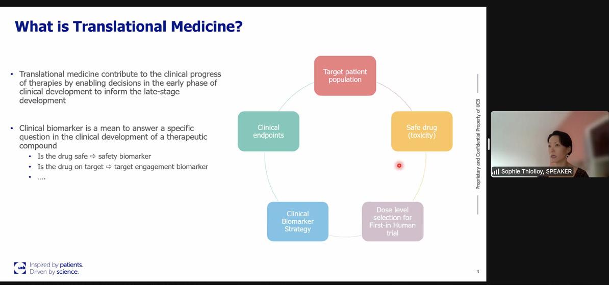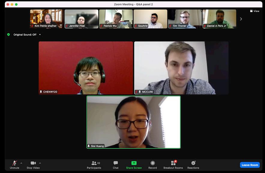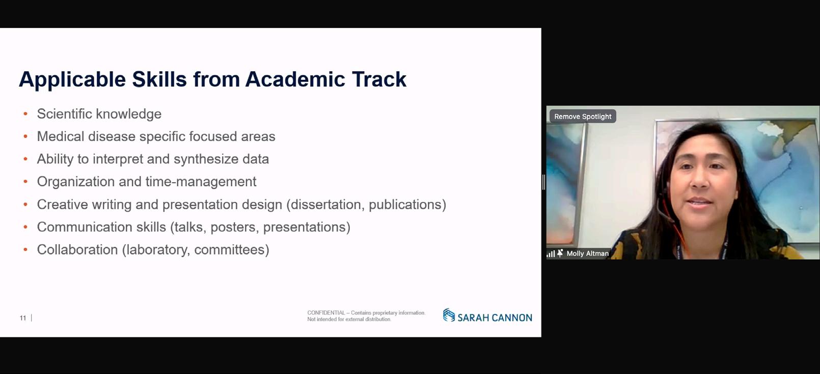 Above, Molly Altman, PhD, shares about her role while serving as a panelist for Sarah Cannon Research. Right, Dan O’Brien, PhD, shares about his role as a Scientific Director with AbbVie. Below, Sarah Petersen, PhD, discusses her work teaching on the college level at Kenyon College.