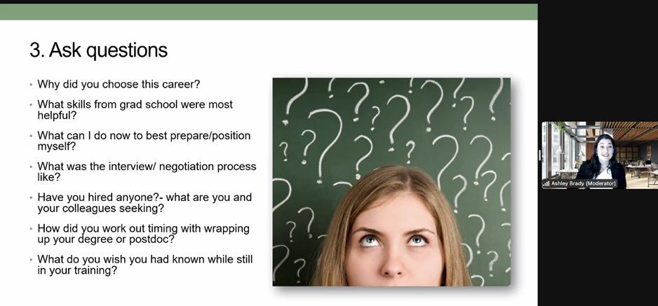 Dr. Thompson emphasized practicality and strived to “acknowledge the difficulties that people go through when transitioning from academia to industry.” He discussed the differences between academic and corporate research environments, and the ways in which to break down barriers through networking, interview skills, and job searches. His best recommendations for preparing for interviews included (1) employing the STAR method for answering questions, which involves considering the situation, task, action, and result of a situation or challenge, (2) ensuring that one knows everything mentioned in his or her resume, and (3) preparing good questions to ask the interviewer.