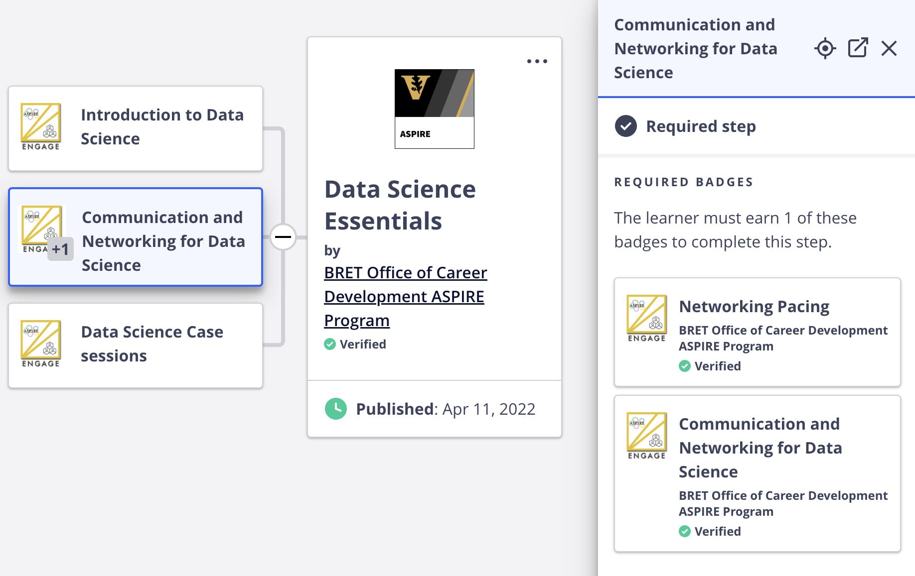 The ASPIRE Program is now awarding badges through Badgr to graduate students and postdoctoral fellows who fully complete any of our ASPIRE modules or other experiential learning opportunities. The micro-credentialing program launched in the spring of 2021 through a partnership with the VU Process and Systems Implementation team, helping the ASPIRE Program to achieve a long-time goal of tracking trainee progress and supporting them in capturing and highlighting their professional development efforts outside of the lab. These badges can aggregate and shed light on the interests, capabilities, and accomplishments of learners; moreover, they can serve as the stepping stones, guiding trainees along a learning pathway.