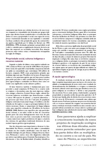 A opção agroecológica A revolução mexicana, ocorrida há um século, obteve duas conquistas impensáveis para sua época e de enorme atualidade: a recampesinização do meio rural, como resultado do desmembramento dos latifúndios, e o resgate e a reinvenção da matriz cultural centro-americana, que devolveu a terra aos povos indígenas ao reconhecer o direito a suas propriedades ancestrais. Fez-se assim justiça, revalorizando a pequena propriedade (o tamanho médio das parcelas agrícolas é de 9 hectares por família, além do direito de acesso às áreas comunais de cerca de 25 hectares) e renovando uma cultura que há pelo menos 9 mil anos promove um processo de interação com os recursos naturais. Ao resgatar essa memória biocultural, a revolução mexicana restabeleceu uma conexão com o passado milenar, assentado em crenças, saberes e práticas, que hoje configuram uma sabedoria de enorme valor (TOLEDO e BARRERA-BASSOLS, 2008).