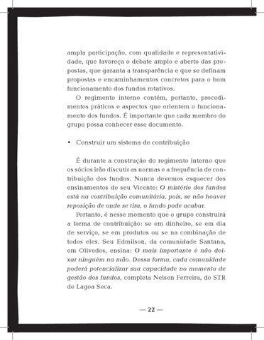 • Construir um sistema de contribuição É durante a construção do regimento interno que os sócios irão discutir as normas e a frequência de contribuição dos fundos. Nunca devemos esquecer dos ensinamentos de seu Vicente: O mistério dos fundos está na contribuição comunitária, pois, se não houver reposição de onde se tira, o fundo pode acabar. Portanto, é nesse momento que o grupo construirá a forma de contribuição: se em dinheiro, se em dia de serviço, se em produtos ou se na combinação de todos eles. Seu Edmilson, da comunidade Santana, em Olivedos, ensina: O mais importante é não deixar ninguém na mão. Dessa forma, cada comunidade poderá potencializar sua capacidade no momento de gestão dos fundos, completa Nelson Ferreira, do STR de Lagoa Seca. — 22 —