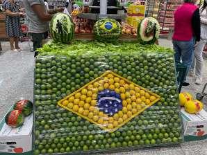 Uma dica é usar os próprios produtos para simbolizar a torcida, como esse painel de limão e laranja ao lado. passar sem se impressionar.