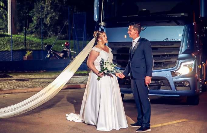 Mateus Wendt, mecânico do concessionário Mallon, levou o amor pela estrela até o altar! Em março de 2025, Mateus casou-se com a noiva, Joana, e foi até a celebração a bordo de um Actros 2653. O caminhão também serviu de cenário para as fotos do casal, que ficaram incríveis!