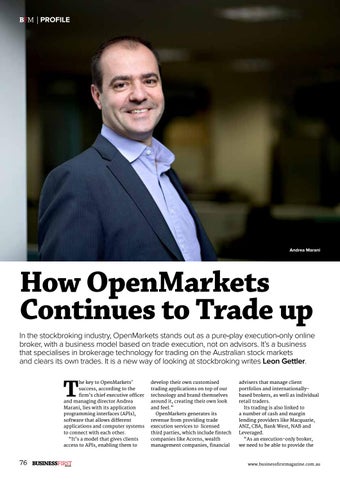 he key to OpenMarkets’ success, according to the firm’s chief executive officer and managing director Andrea Marani, lies with its application programming interfaces (APIs), software that allows different applications and computer systems to connect with each other. “It’s a model that gives clients access to APIs, enabling them to