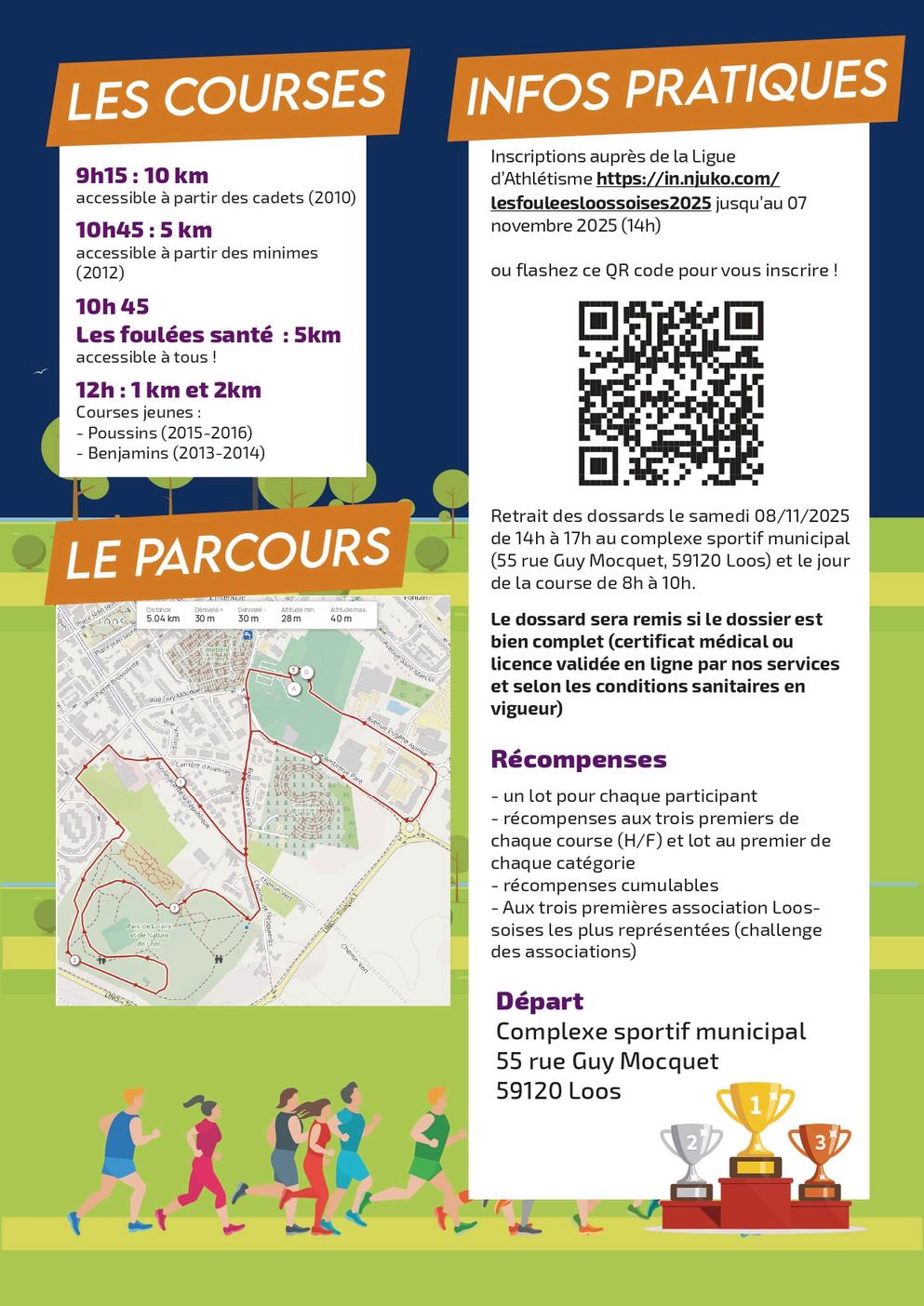 Le 9 novembre prochain aura lieu les foulées Loosoises. Les participants auront le choix entre une course de 10 km, une de 5 km et une marche (les foulées santé) de 5 km également. Et nouveauté cette année, la course poussin avec 1 ou 2 km. Cette année verra le retour du challenge des associations. Vous voyez où nous voulons en venir ? La marée violette a été présente à Malo, faisons en sorte qu 'elle soit présente à ces foulées! Cela sera une grande première une marée violette à Loos! Vous trouverez ci-dessous toutes les informations pour y participer.