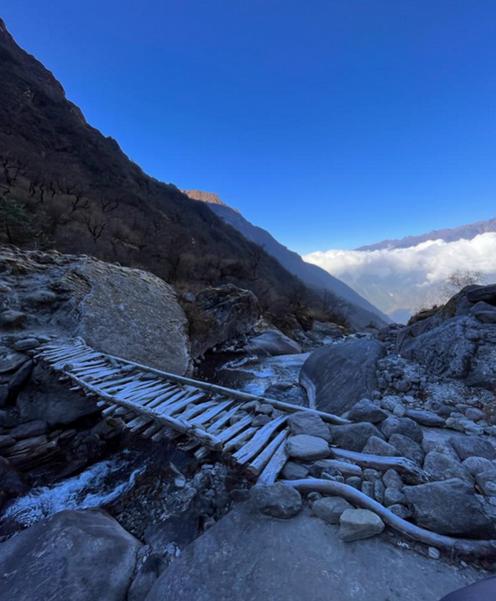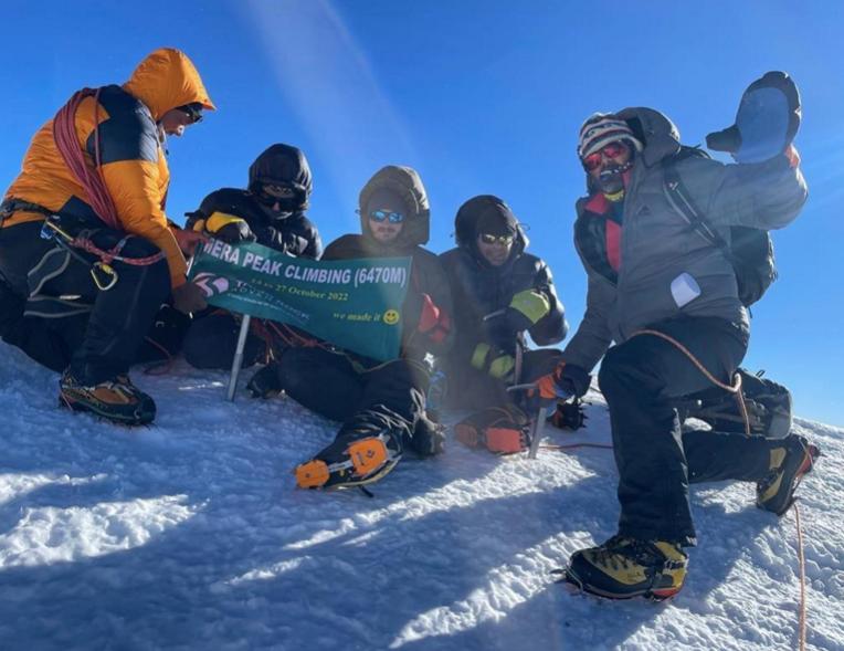 On the 23rd of November, we swallowed our mountain sickness medication, put on our harnesses and crampons, and at 2:30am, left Mera high camp (5800m) to attempt reaching the summit. With blood oxygen saturations of only 55%, it was impossible to walk more than a few steps over the Mera glacier without stopping to catch our breath. With a lot of patience and encouragement from our Sherpa, who despite winds of 95 km/hr and a temperature of -25 degrees, still believed we could summit - and summit we did! By 8:30am, all the group had summited together at the peak of 6546 metres. At that moment, I was overwhelmed with emotion (hypoxia being a large contributor) and of course, exhaustion. Being cautious of crevasses and other dangers at that altitude, we got off the glacier by 15:00, and reached our lodge (4950m) at 17:00.