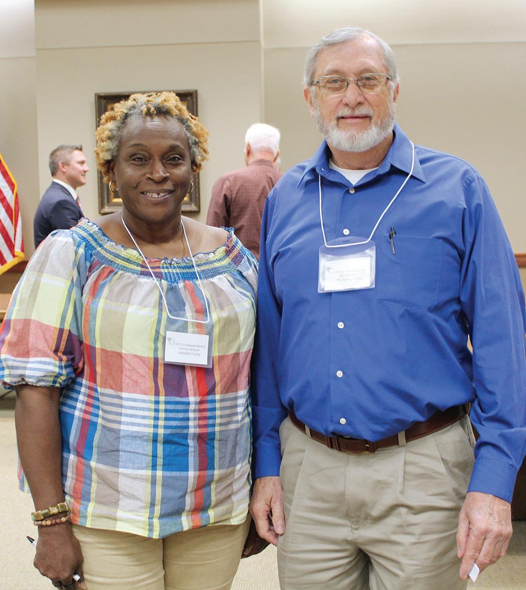 Above: Lafayette County Justice of the Peace LeNora Jackson and Hot Spring County Justice of the Peace Don Hilyard pose for a photo during a break in the meeting.