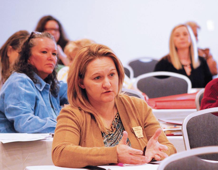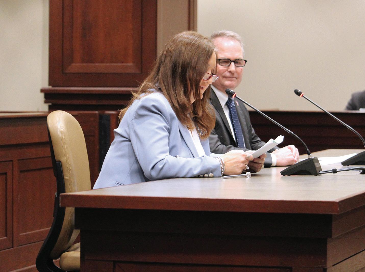 Right: Scott County Clerk Tracy McPherson asks a question during a roundtable portion of the meeting. Looking on is Pope County Clerk Pam Ennis