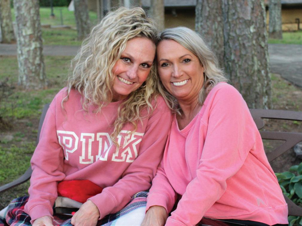 Right: Jerri Lynn Wagner and Margaret Hamilton,of Franklin County, enjoy time together at the end of the first meeting day. Far right: Chicot County Collector Jolecia Manning, left, presents Boone County Collector Amy Jenkins with a customized cup.