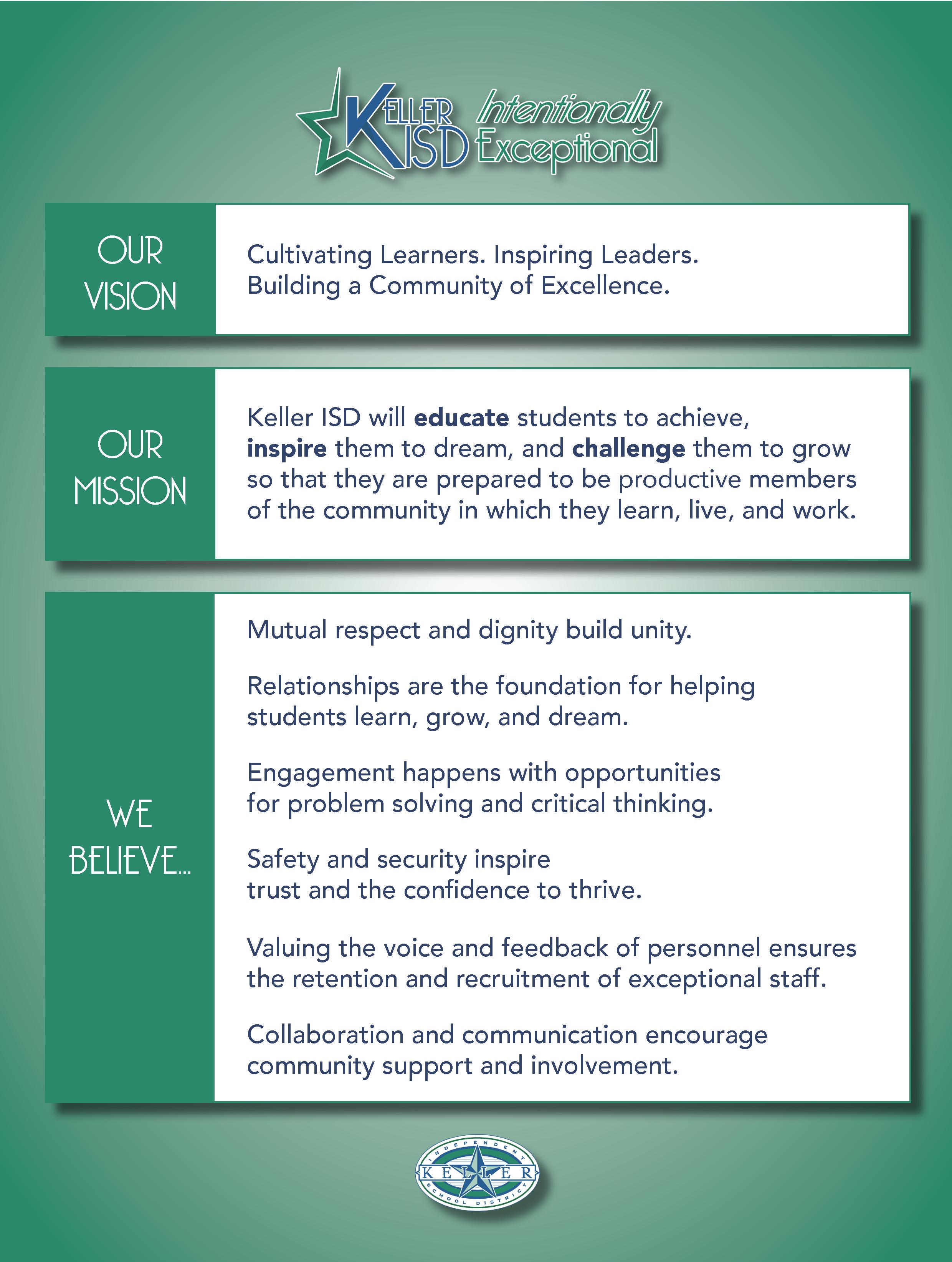 From a District standpoint, we started the year revisiting our Strategic Planning initiatives to help guide our priorities over the next five years. We selected 60 parents, educators, and community members who met several times over the course of the fall. The selected individuals were from different grade levels, different areas of interest and involvement, and different geographic corners of the District, making every effort to represent all stakeholders in our community. I’m proud to say that we were able to successfully establish new Vision, Mission, Belief and Objective statements that will act as a roadmap, reflecting the Keller ISD community’s educational priorities as we look towards the future.