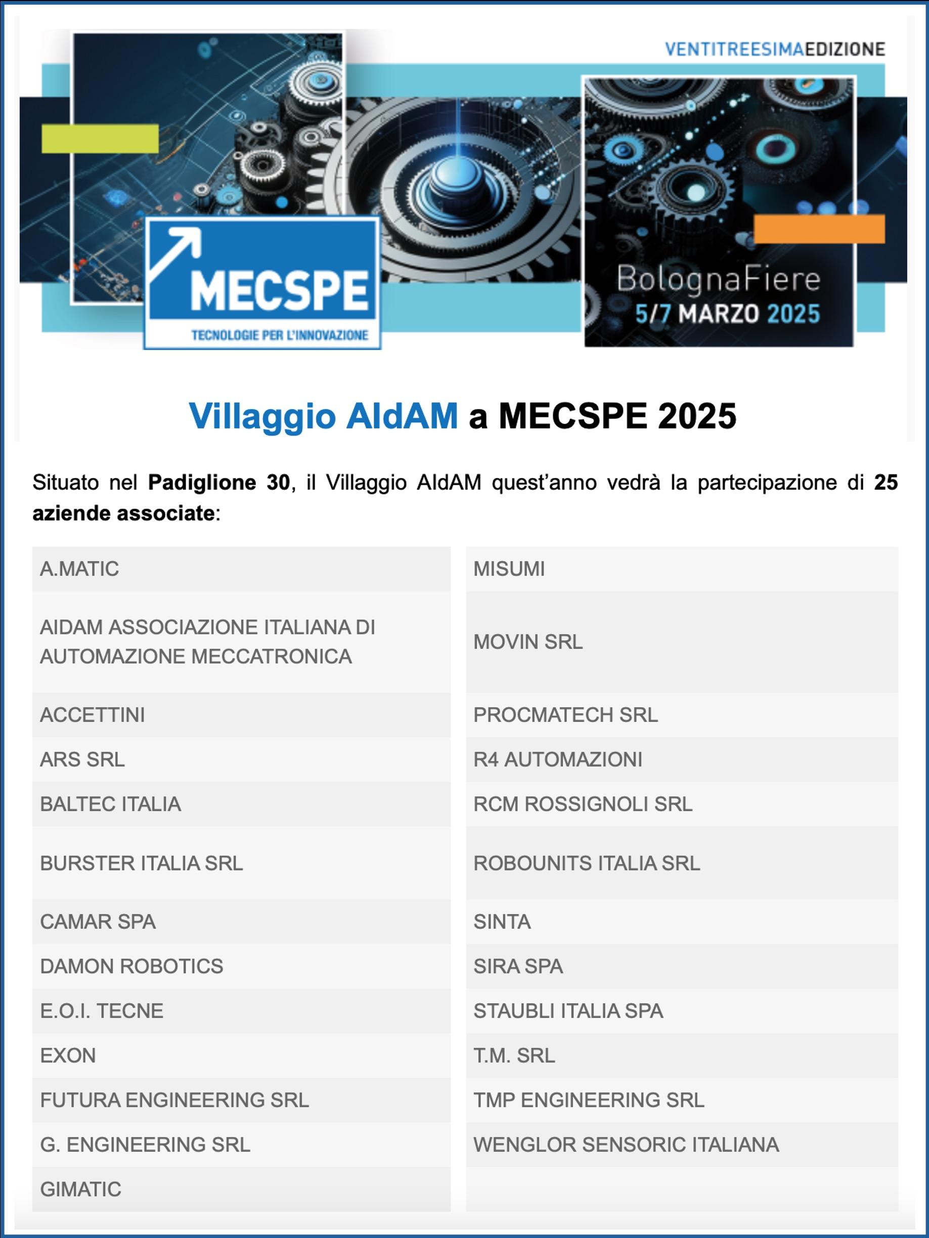 Il Villaggio AIdAM di 1 000 mq con 24 Aziende Associate sarà nel padiglione 30 Saranno presenti: Trasferimento di conoscenze