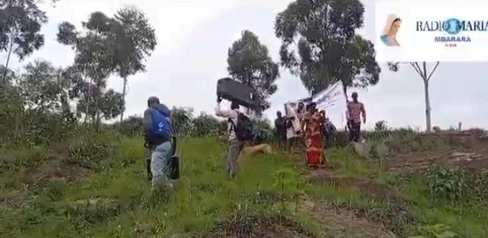 Qui il sacerdote direttore guida la salita dello staff … raggiungono un villaggio lontano per effettuare un collegamento di preghiera da trasmettere su Radio Maria Uganda!