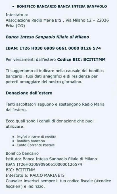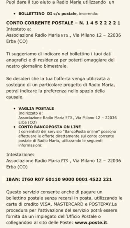 Intestato a: Radio Maria ETS, Via Milano 12 – 22036 Erba (CO)