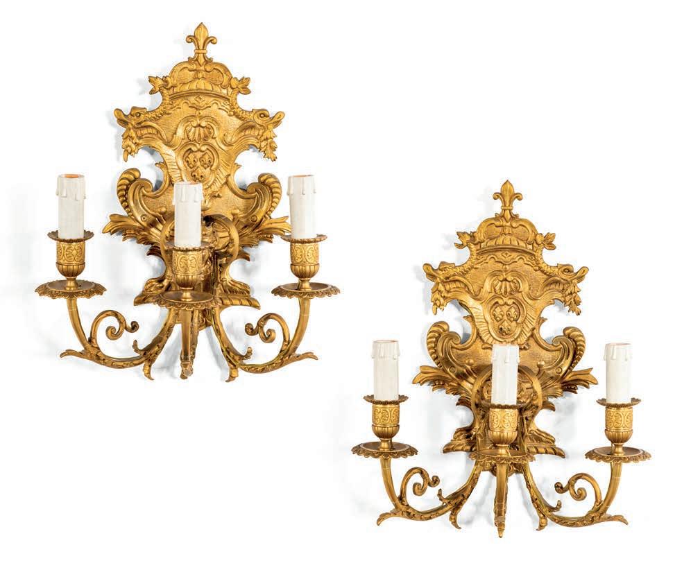 DI APPLIQUES IN BRONZO DORATO A TRE LUCI, FRANCIA, XIX SECOLO bracci arcuati abbelliti da rilievi vegetali, emergenti da un supporto parietale a scudo con mascherone e stemma d’invenzione con tre gigli medicei cm 37x30x18