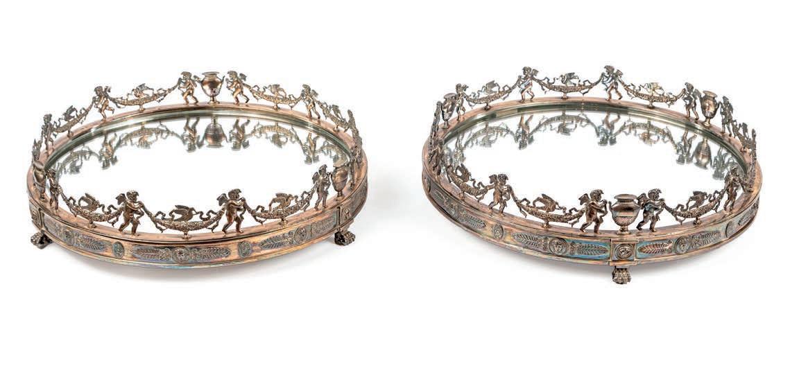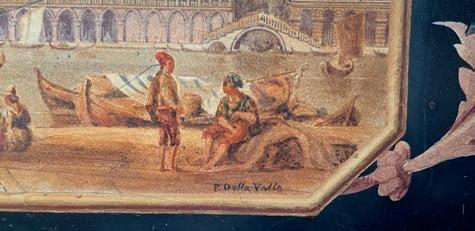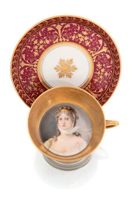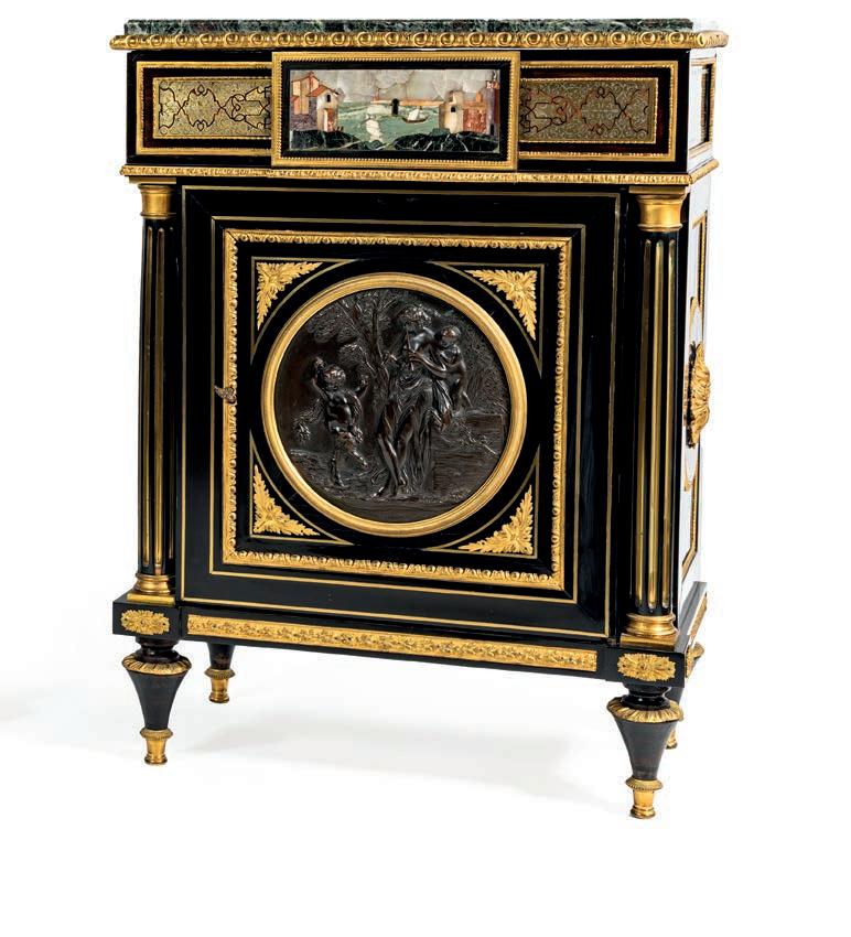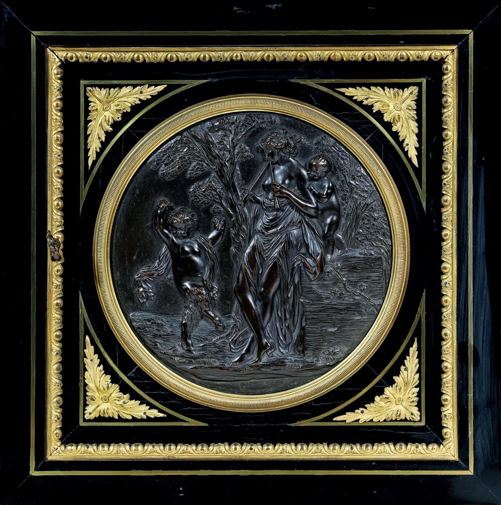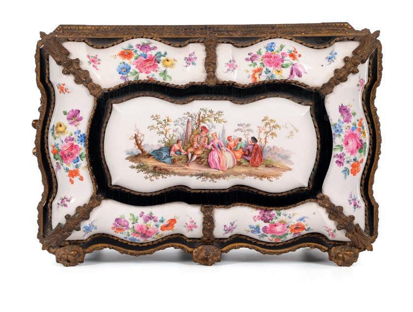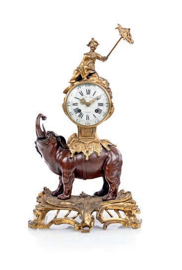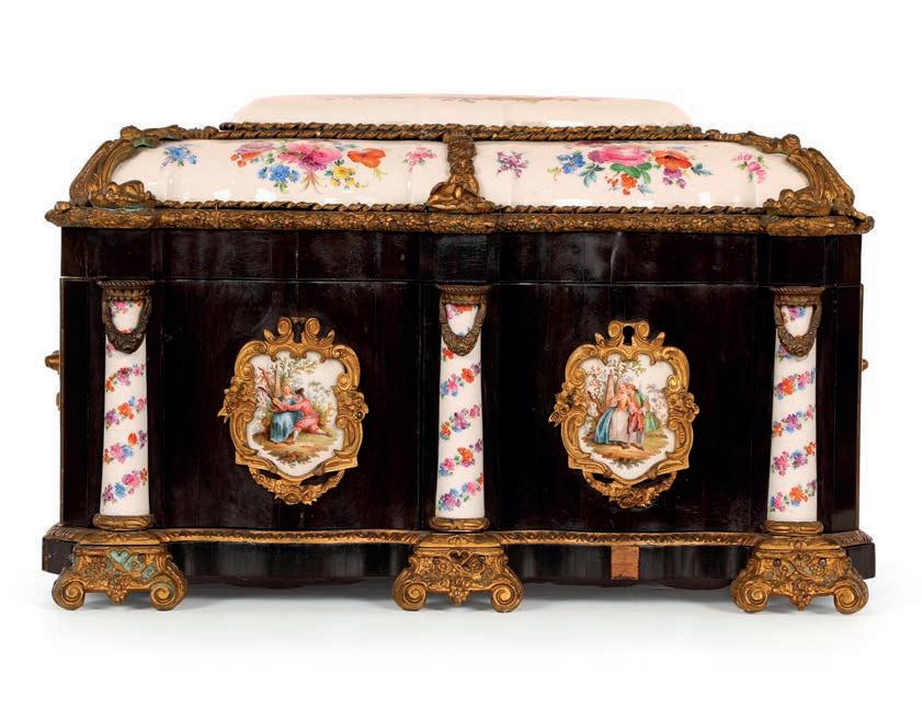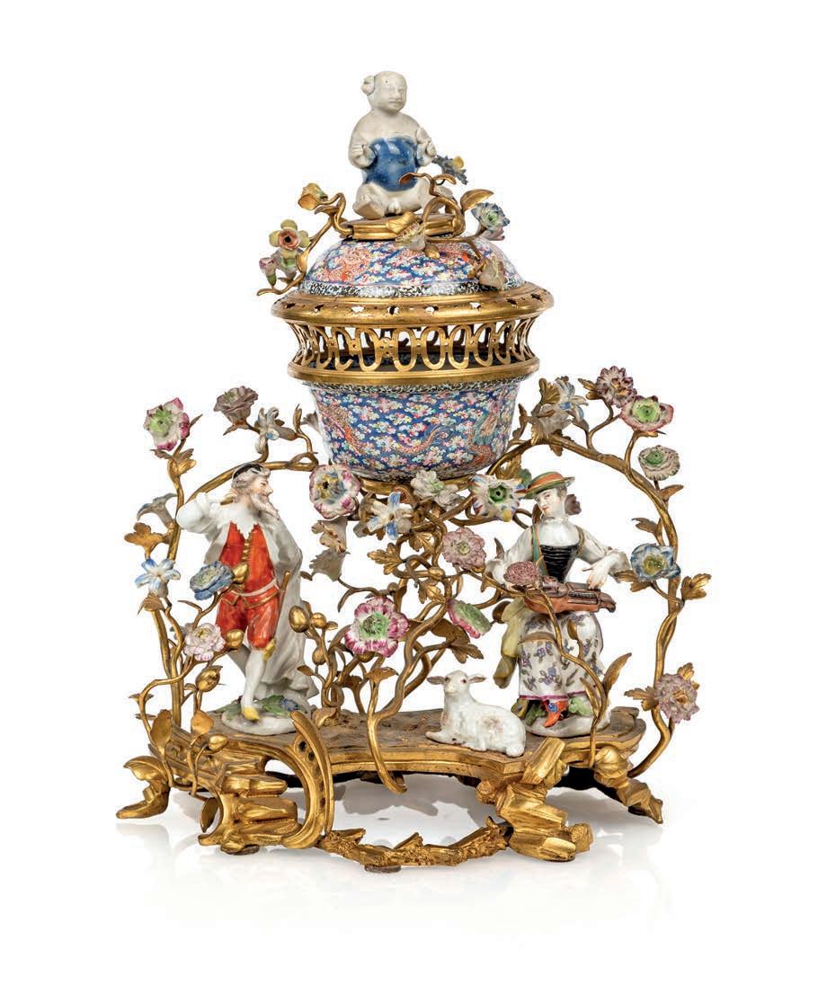 corpo a vaso decorato in vivace policromia con fgure mitologiche e puttini ambientati in un paesaggio bucolico; lungo il proflo superiore, su cui è fssato il coperchio, si dispongono ad anello, con movimento orizzontale, due ordini di placchette in smalto bianco con indicazione oraria a numeri romani ed arabi per i minuti. Corone d’alloro abbelliscono le anse squadrate e i due riccioli che fungono da sostegno. Basamento in bronzo dorato. Meccanica da revisionare, frmata “Gailleaux à Paris”. Questa pendola si confgura non solo come strumento di misurazione del tempo, ma come oggetto scultoreo decorativo, in cui la forma del vaso antico diventa pretesto per una sintesi armoniosa di arti diverse: orologeria, bronzistica e pittura su porcellana.