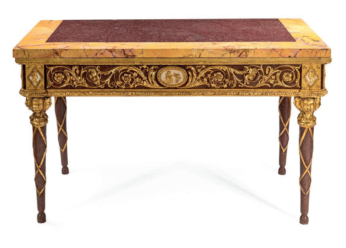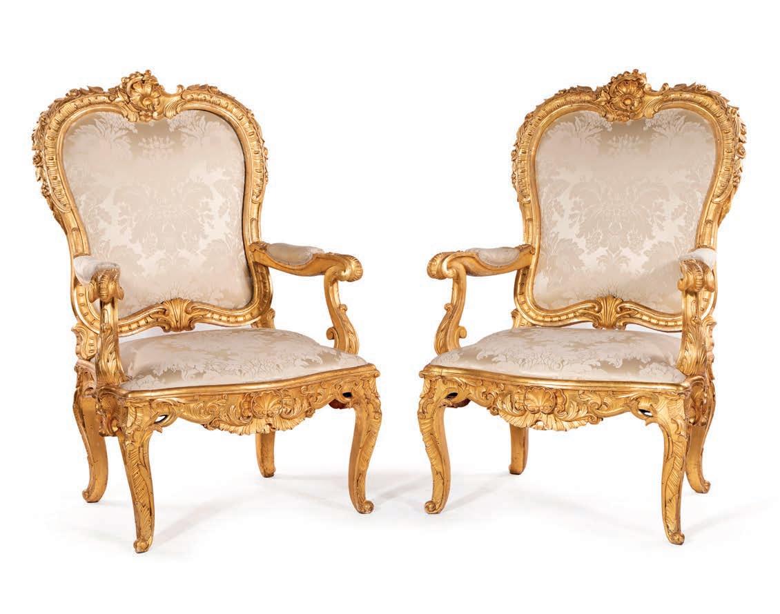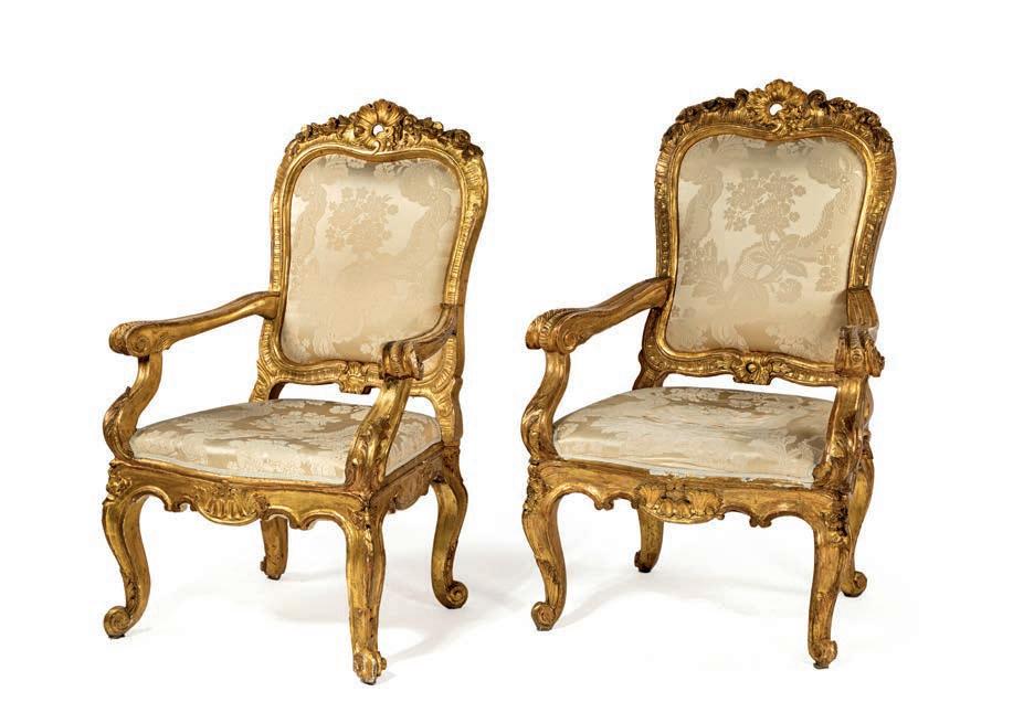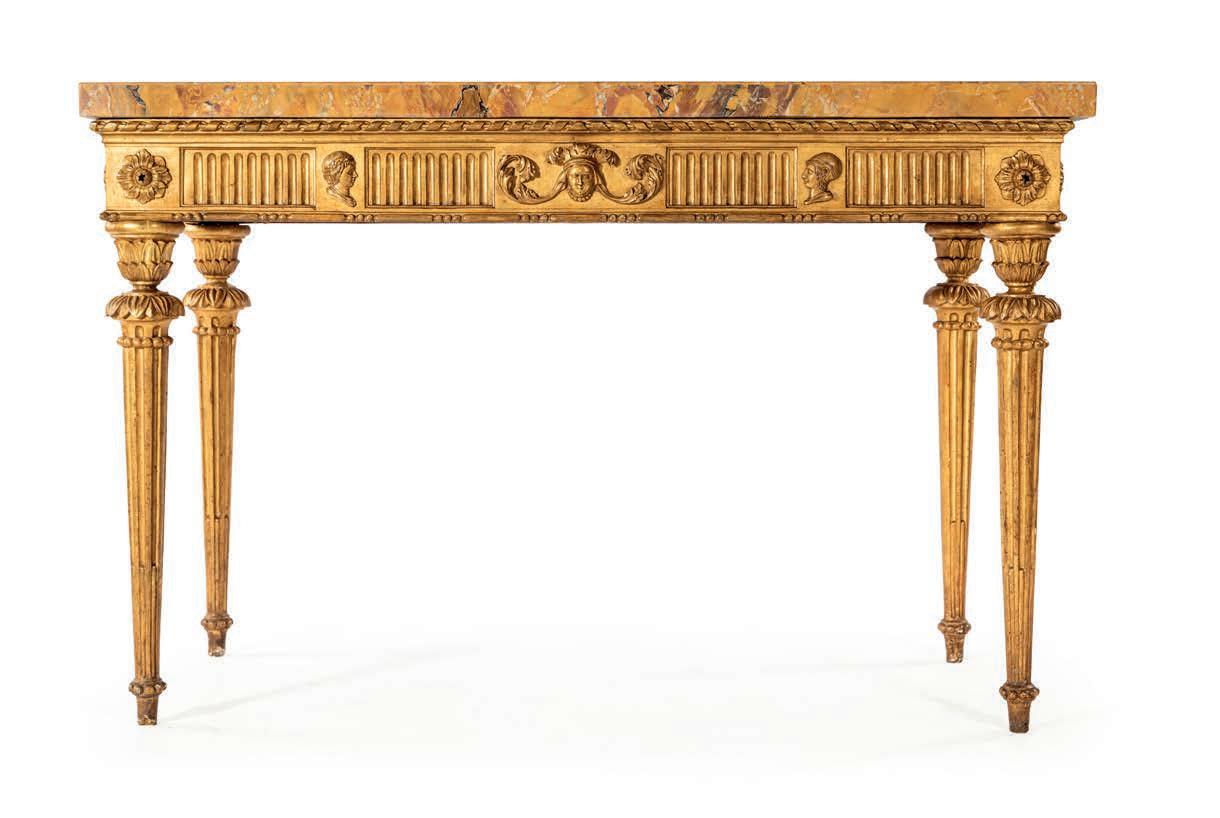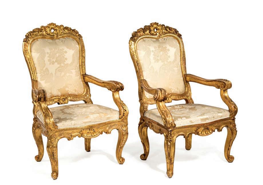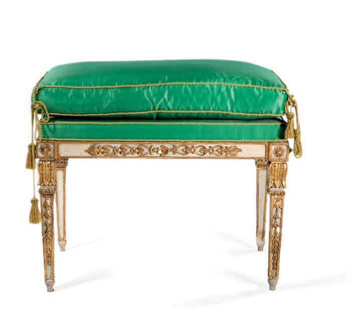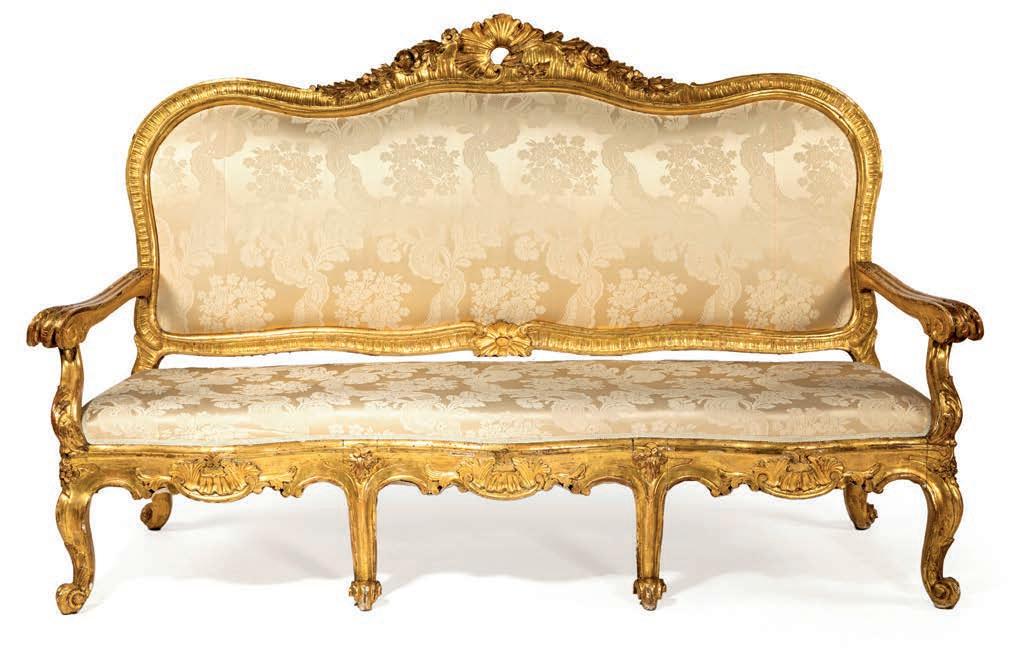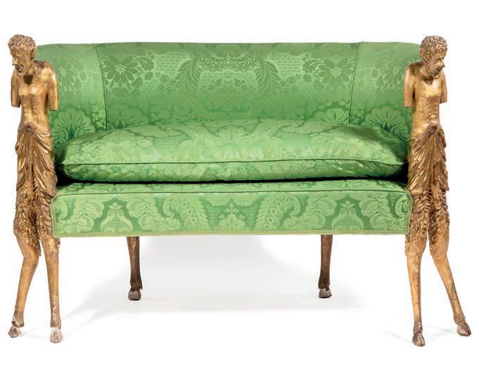 SCOLPITO E DORATO CON FIGURE DI FAUNO, VENEZIA, FINE DEL XVIII/INIZIO DEL XIX SECOLO di forma avvolgente, reca schienale, sedile e cuscini imbottiti e rivestiti in broccato di seta verde; i braccioli sono risolti da due fgure di fauno fnemente intagliate e dorate, colte in posa stante, con il busto leggermente inclinato in avanti a sostenere idealmente la seduta. Questo divano si inserisce nel flone del neoclassicismo di gusto archeologizzante, diffusosi in Europa tra la fne del XVIII e il primo quarto del XIX secolo, quando la riscoperta dell’antico, alimentata dagli scavi di Ercolano e Pompei, infuenzò profondamente le arti decorative. Divani con braccioli fgurati sono documentati proprio in area veneziana tra il 1790 e il 1820, spesso destinati a palazzi patrizi o ville di terraferma. cm 85x120x50