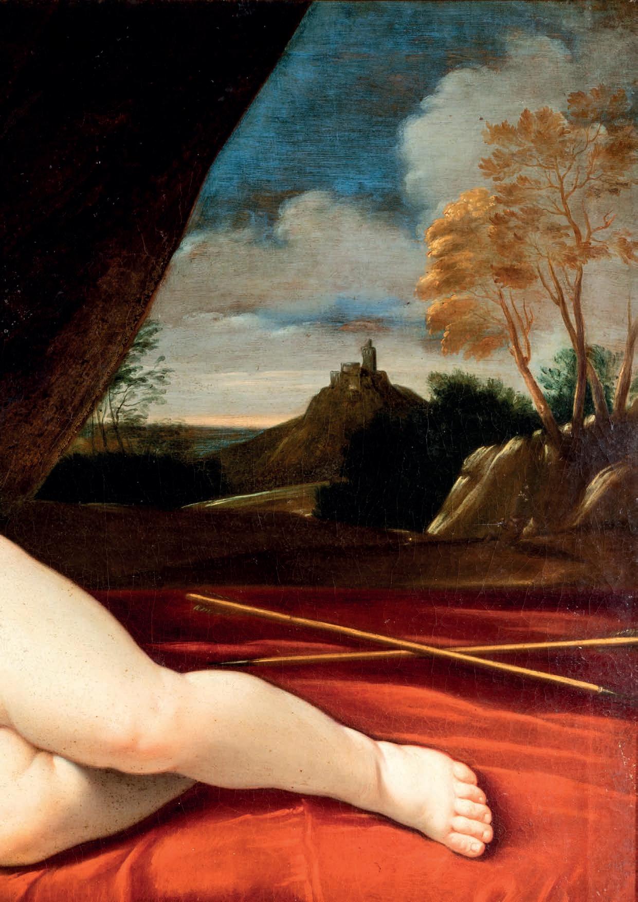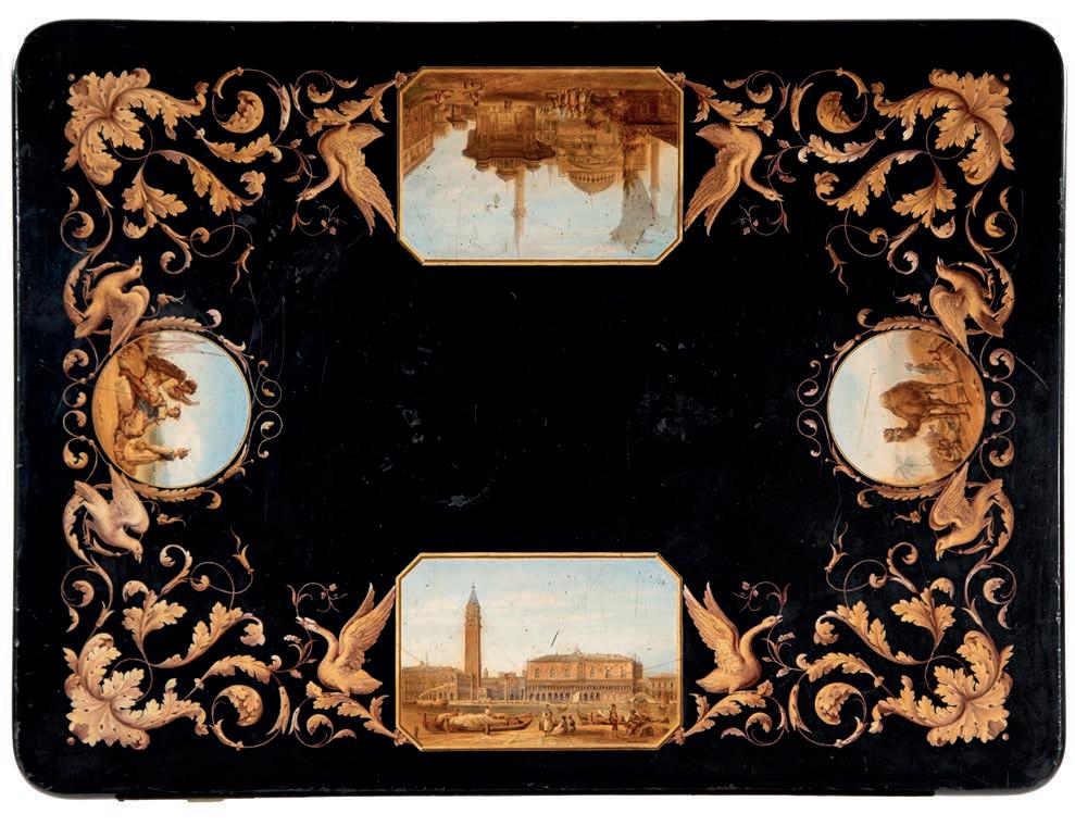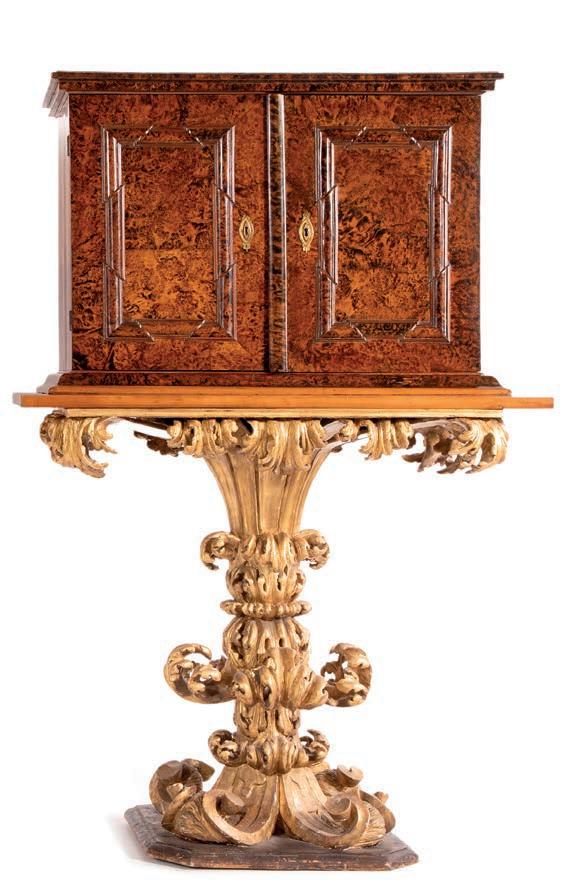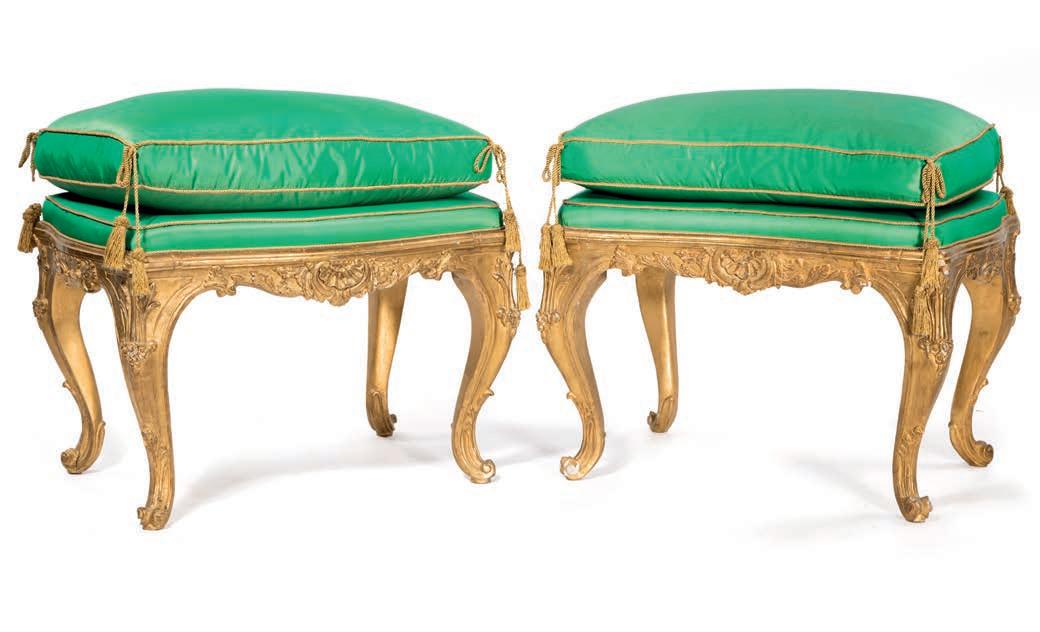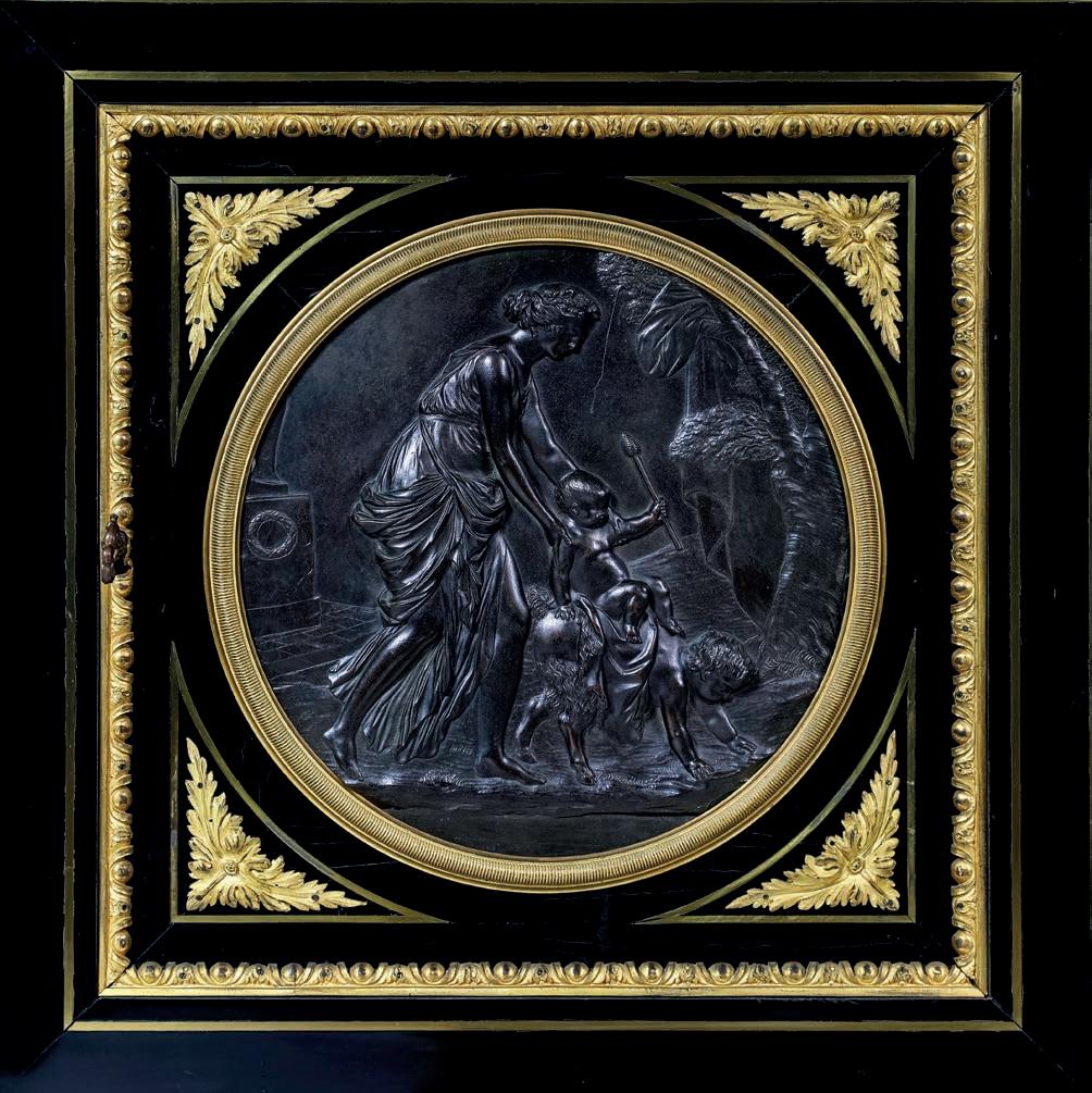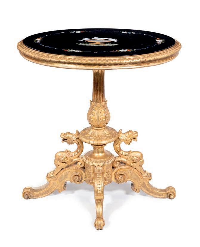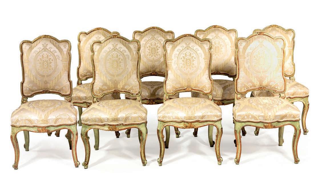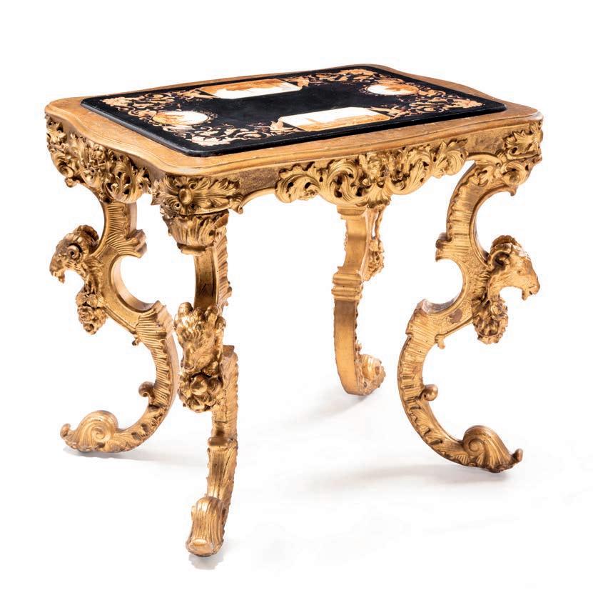 SCOLPITO E DORATO CON FIGURE DI FAUNO, VENEZIA, FINE DEL XVIII/INIZIO DEL XIX SECOLO di forma avvolgente, reca schienale, sedile e cuscini imbottiti e rivestiti in broccato di seta verde; i braccioli sono risolti da due fgure di fauno fnemente intagliate e dorate, colte in posa stante, con il busto leggermente inclinato in avanti a sostenere idealmente la seduta. Questo divano si inserisce nel flone del neoclassicismo di gusto archeologizzante, diffusosi in Europa tra la fne del XVIII e il primo quarto del XIX secolo, quando la riscoperta dell’antico, alimentata dagli scavi di Ercolano e Pompei, infuenzò profondamente le arti decorative. Divani con braccioli fgurati sono documentati proprio in area veneziana tra il 1790 e il 1820, spesso destinati a palazzi patrizi o ville di terraferma. cm 85x120x50