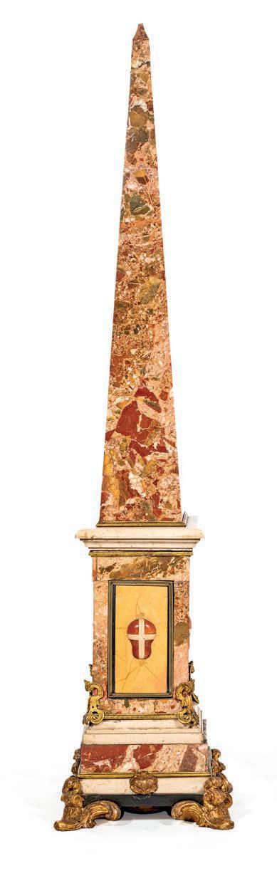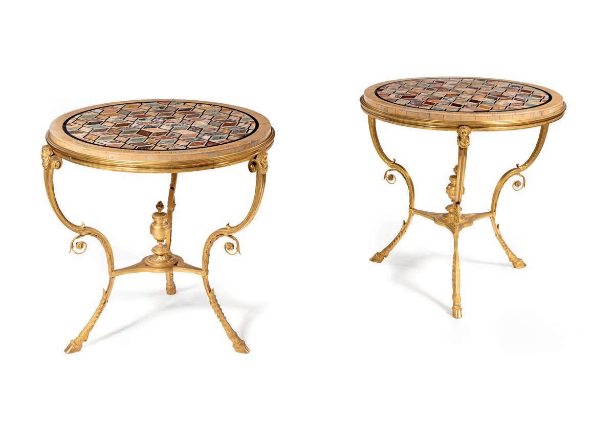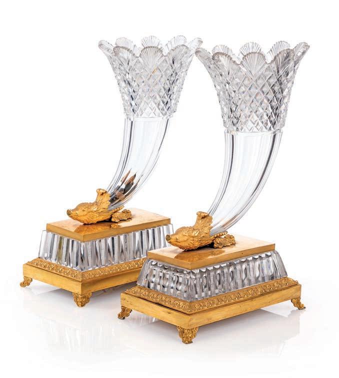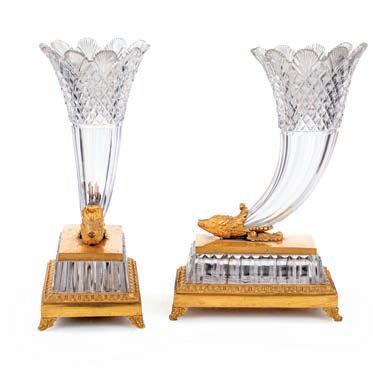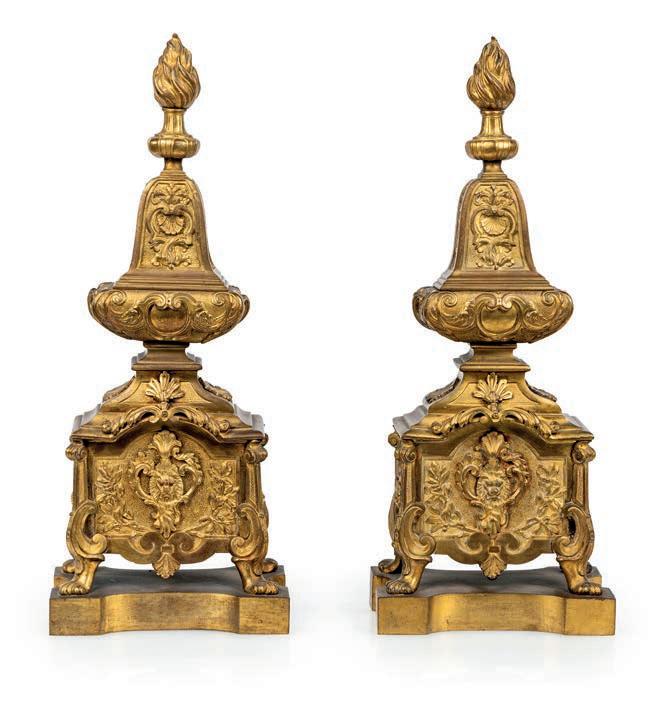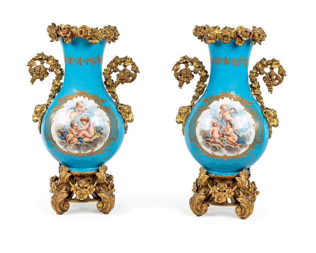 corpo ad anfora fondo turchese lumeggiato in oro, decorato da fgure di amorino entro bordura dorata a motivi vegetali, cui corrisponde una vivace composizione di fori multiformi e variopinti diametralmente opposta; sui lati teste d’ariete in bronzo dorato dalla cui sommità si erge un lungo stelo terminante a ricciolo su cui si avvolgono tralci di vite con grappoli d’uva. Orlo superiore percorso da rose in bronzo dorato; sostegno a rocchetto sorretto da motivi vegetali riuniti da ghirlande forite. Questa coppia di vasi si colloca nella produzione francese ottocentesca di gusto neorococò, ispirata ai modelli della Manifattura di Sèvres del XVIII secolo, in particolare per l’uso del fondo turchese “bleu céleste”, le riserve fgurate con amorini e la ricca doratura. Rispetto agli esemplari settecenteschi, le montature in bronzo dorato risultano più sviluppate e scenografche, secondo un gusto tipico ottocentesco della produzione parigina destinata all’arredo di rappresentanza. altezza cm 53