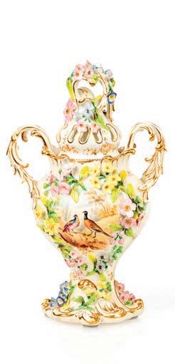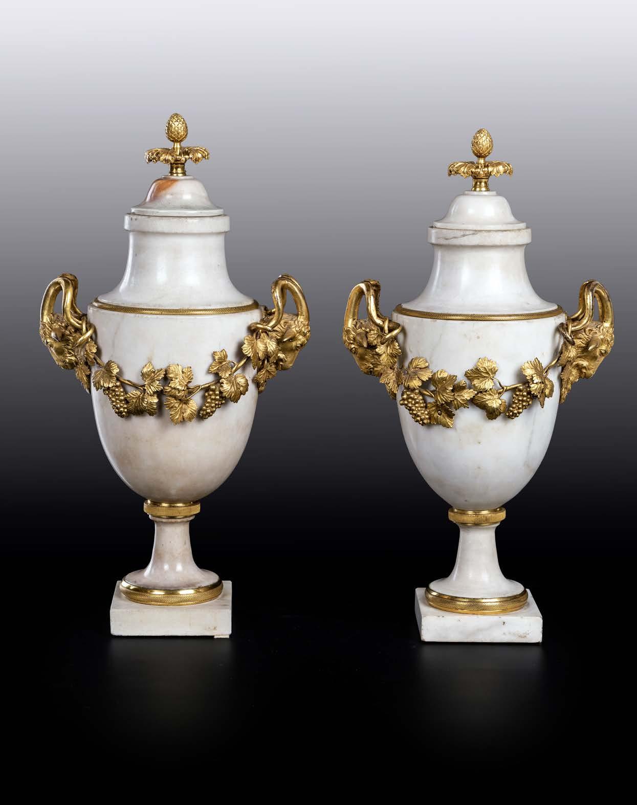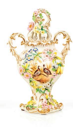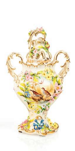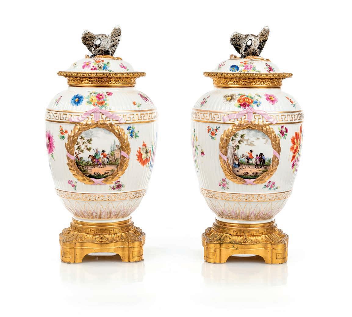 COPPIA DI VASI CON COPERCHIO IN PORCELLANA BIANCA CON FIORI POLICROMI E BRONZO DORATO, GERMANIA, XIX SECOLO corpo ovoidale centrato da miniature circolari raffguranti paesaggi con fgure a cavallo racchiuse da una ghirlanda d’alloro modellata in rilievo e dorata; tutt’intorno si dispongono motivi foreali multiformi e variopinti, interrotti da una cintura apicale con motivo a greca e cintura basale con minuti motivi foreali resi in rilievo; coperchio sormontato da rapace. Sostegno ad anello in bronzo dorato su base quadrangolare. altezza cm 48