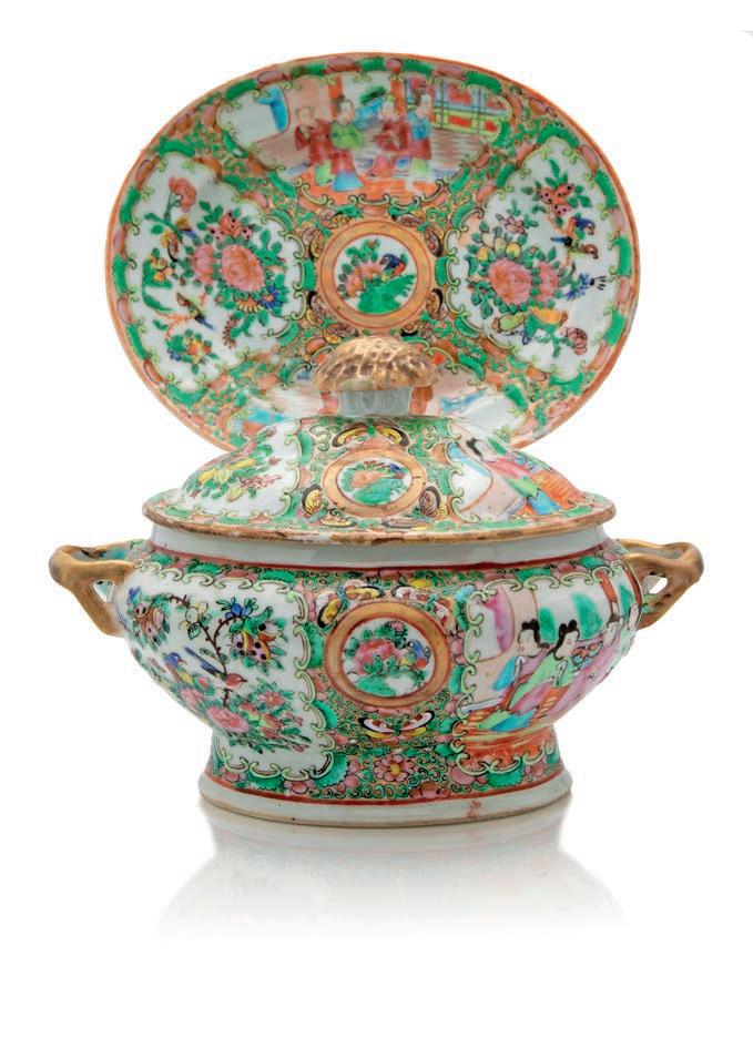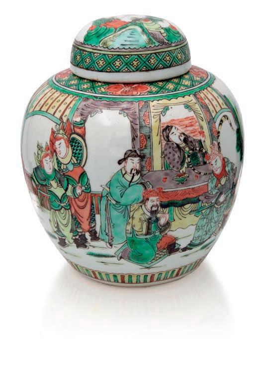 PICCOLO GINGER JAR IN PORCELLANA POLICROMA, CINA, DINASTIA QING, XIX SECOLO corpo globulare con coperchio a cupolino, decorato a smalti policromi secondo il repertorio della famiglia verde, a raffgurare una scena fgurata continua con personaggi di corte e dignitari in ambiente architettonico, nei toni del verde, rosso ferroso e giallo. Fasce geometriche e foreali delimitano la composizione; il coperchio riprende il medesimo impianto decorativo. Esemplare riconducibile alla produzione cinese destinata all’esportazione per il mercato occidentale. altezza cm 20,5