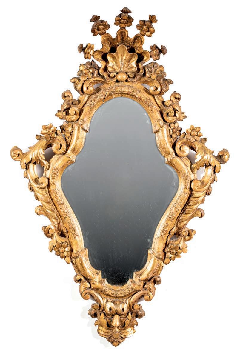 SPECCHIERA IN LEGNO INTAGLIATO E DORATO, XVIII SECOLO cornice sagomata di impianto romboidale a fascia convessa percorsa da rilievi foriti; tutt’intorno si dispongono volute, cartigli, motivi vegetali e fori intagliati che dalla sommità coronata da una conchiglia si dispongono in simmetria lungo l’intero perimetro cm 122x75