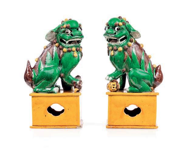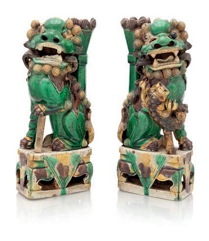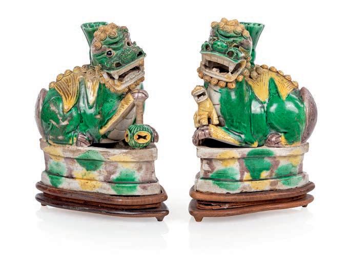 COPPIA DI CANI DI PHO PORTA INCENSO REALIZZATI IN GRES A SMALTI SANCAI, CINA, DINASTIA QING, EPOCA KANGXI, XVIII SECOLO rispettivamente maschio e femmina, su basi poliedriche marezzate sulla parte anteriore e bassi piedistalli sagomati in legno. Occhi mancanti cm 17x13,5x7 compresa la base in legno