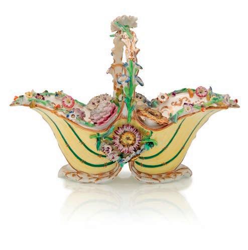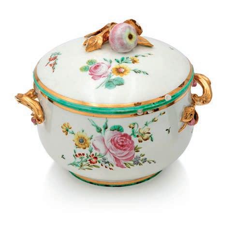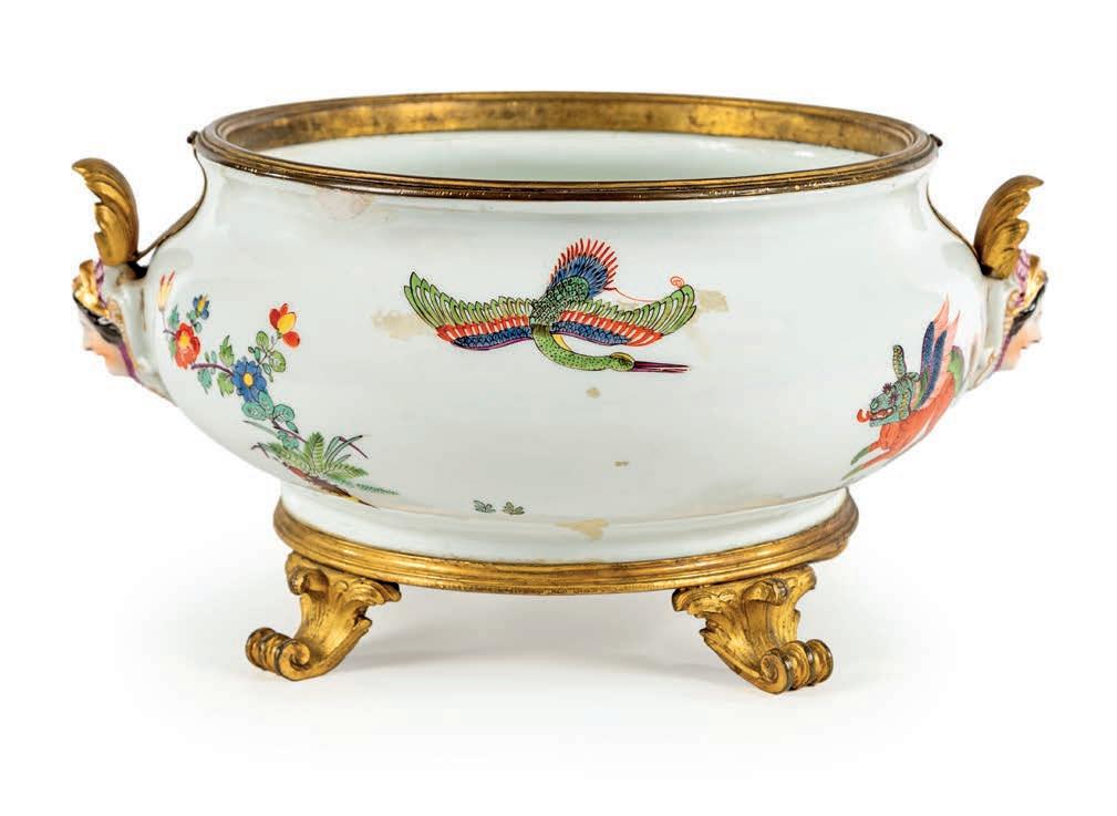 COPPA CENTROTAVOLA IN PORCELLANA DI MEISSEN DEL XVIII SECOLO MONTATA IN BRONZO DORATO, FRANCIA, XIX SECOLO di forma sferica schiacciata con mascheroni femminili modellati in rilievo; la decorazione riprende quella tipica della manifattura giapponese Sakaida Kakiemon con draghi Qilin, aironi, fori ed insetti, nota ai decoratori di Meissen grazie alla collezione di Augusto II detto “il Forte”, presente nel Palazzo giapponese di Dresda. cm 15x30x24