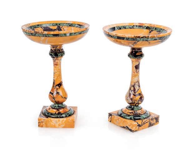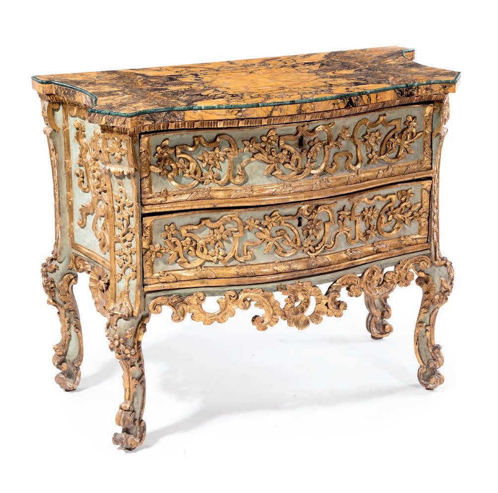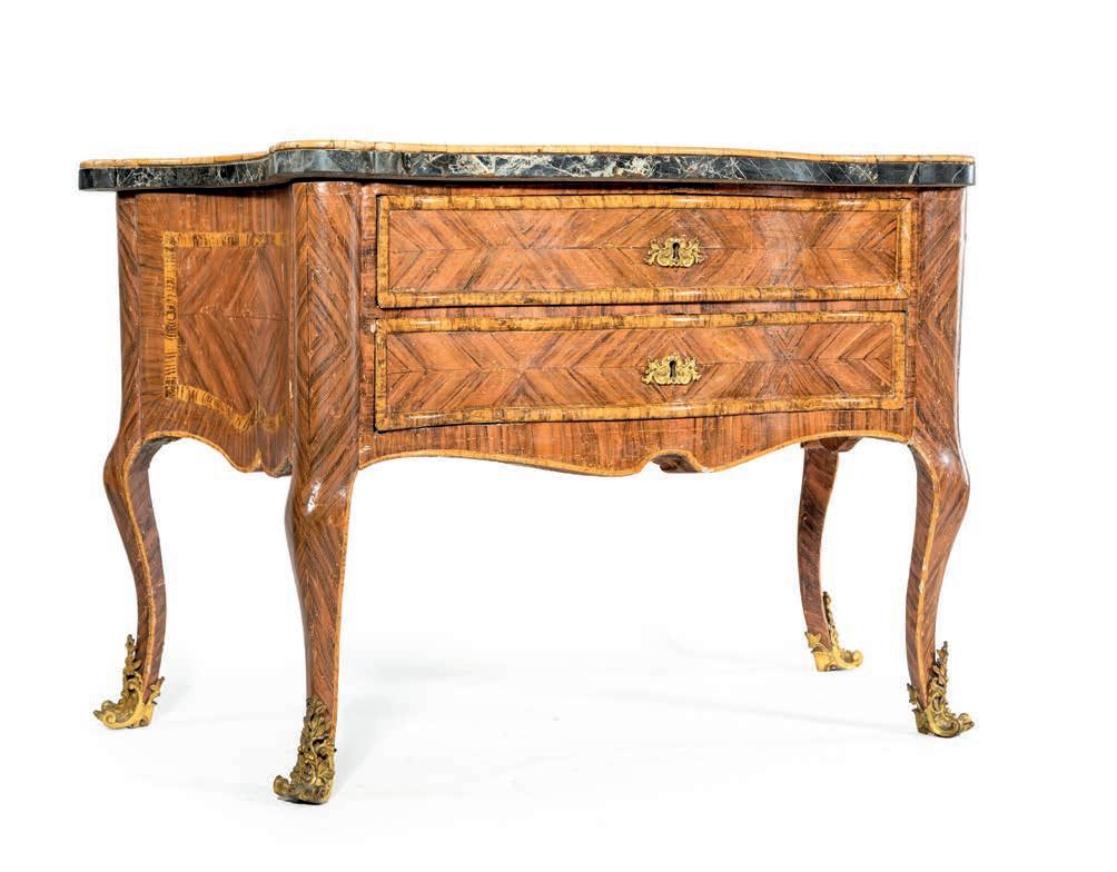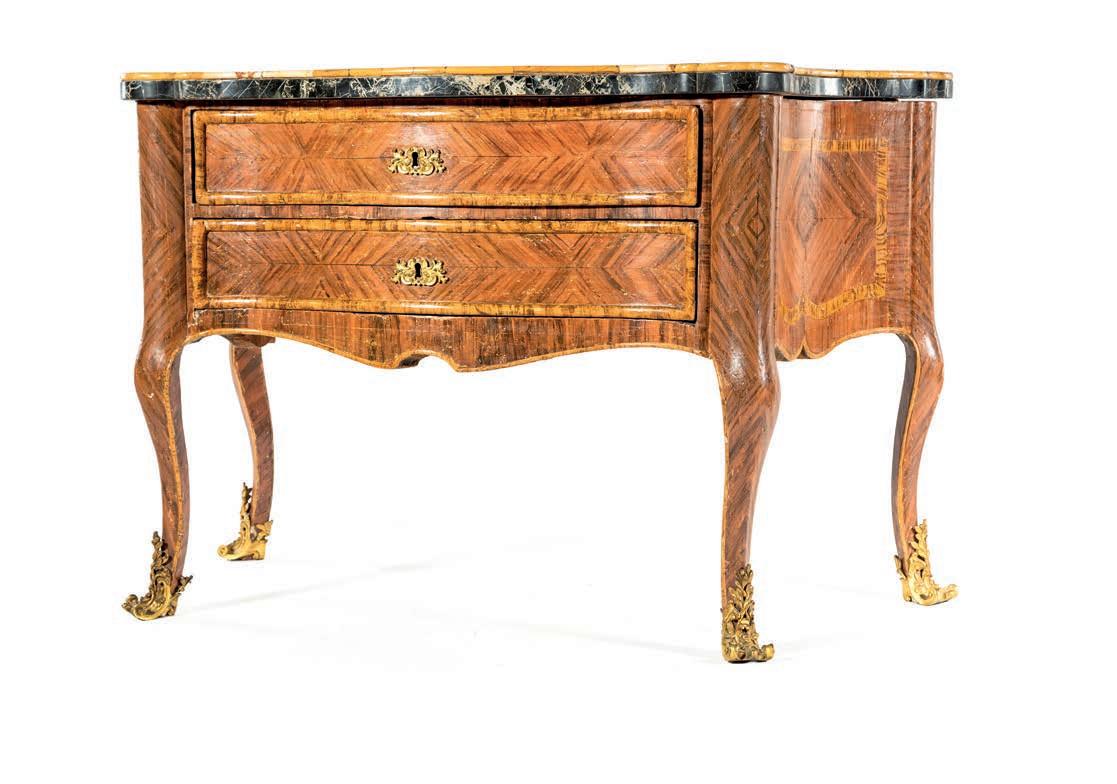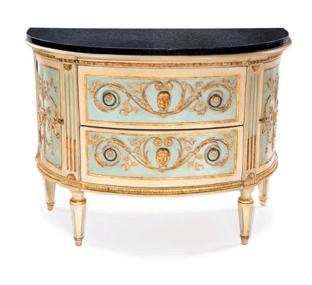 di forma mossa con due cassetti frontali incorniciati da sottili proflature dipinte, sono rifniti superiormente da piani sagomati in marmo nero d’Aquitania con cordolo giallo; gambe sagomate calzate da scarpette in bronzo cesellato e dorato.