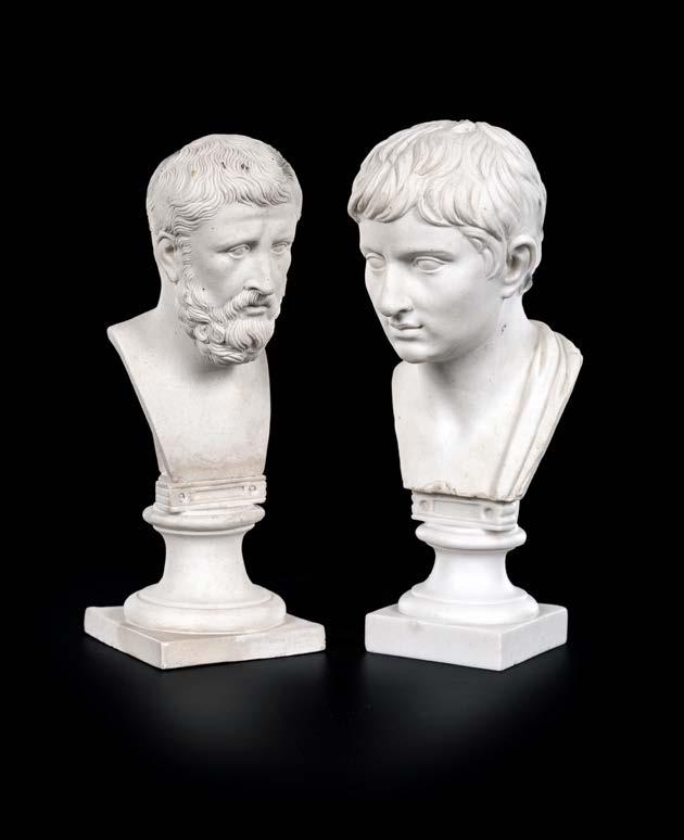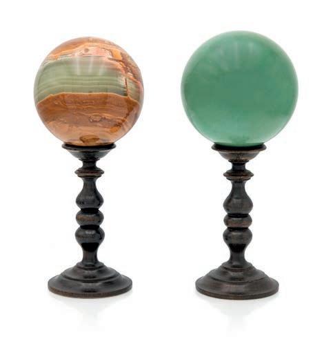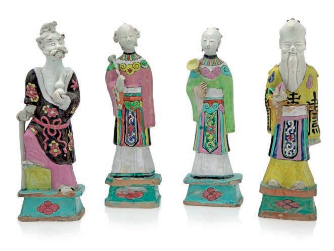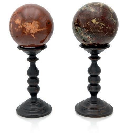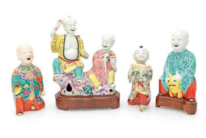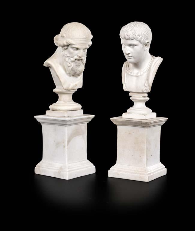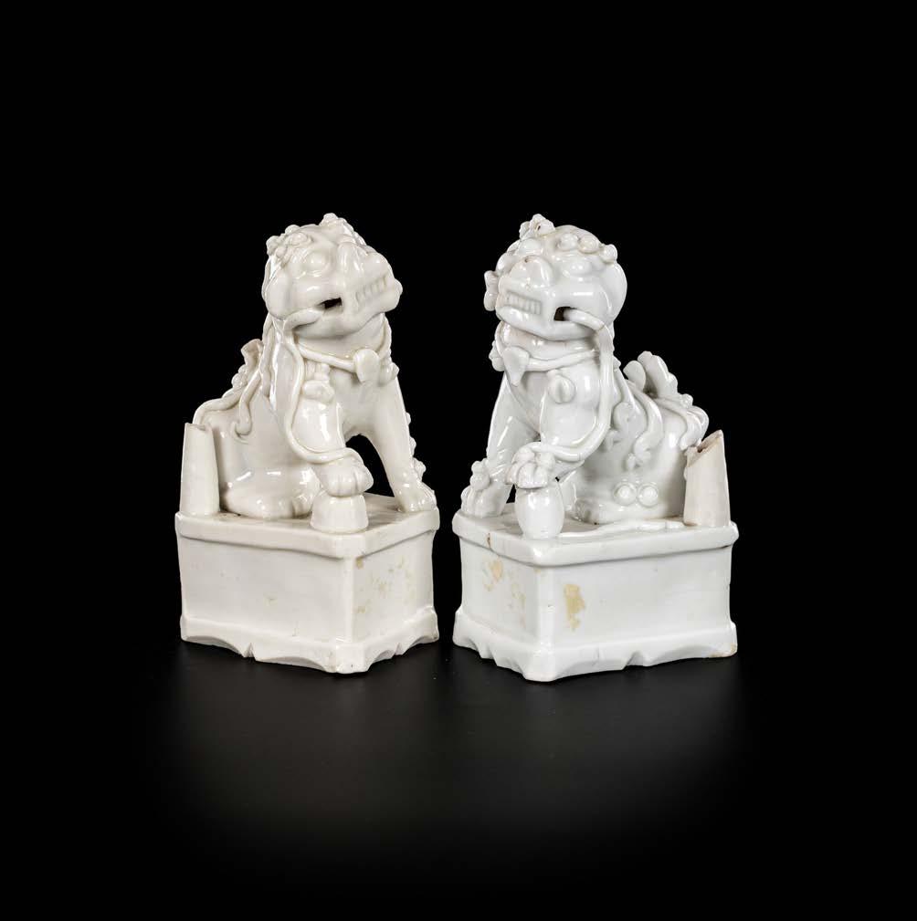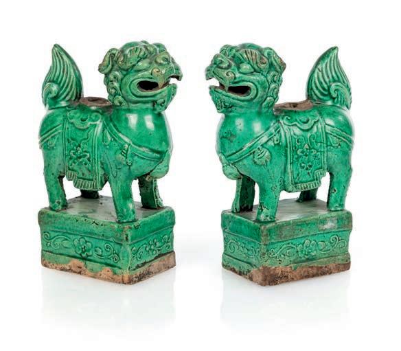 entrambe di genere maschile, ritratti per essere disposti “vis à vis” con sfera rispettivamente sotto la zampa anteriore destra e sinistra su alti piedistalli rettangolari. Recano contenitori cilindrici porta incensi danneggiati. Lievi difetti, rotture e mancanze cm 14x9x6