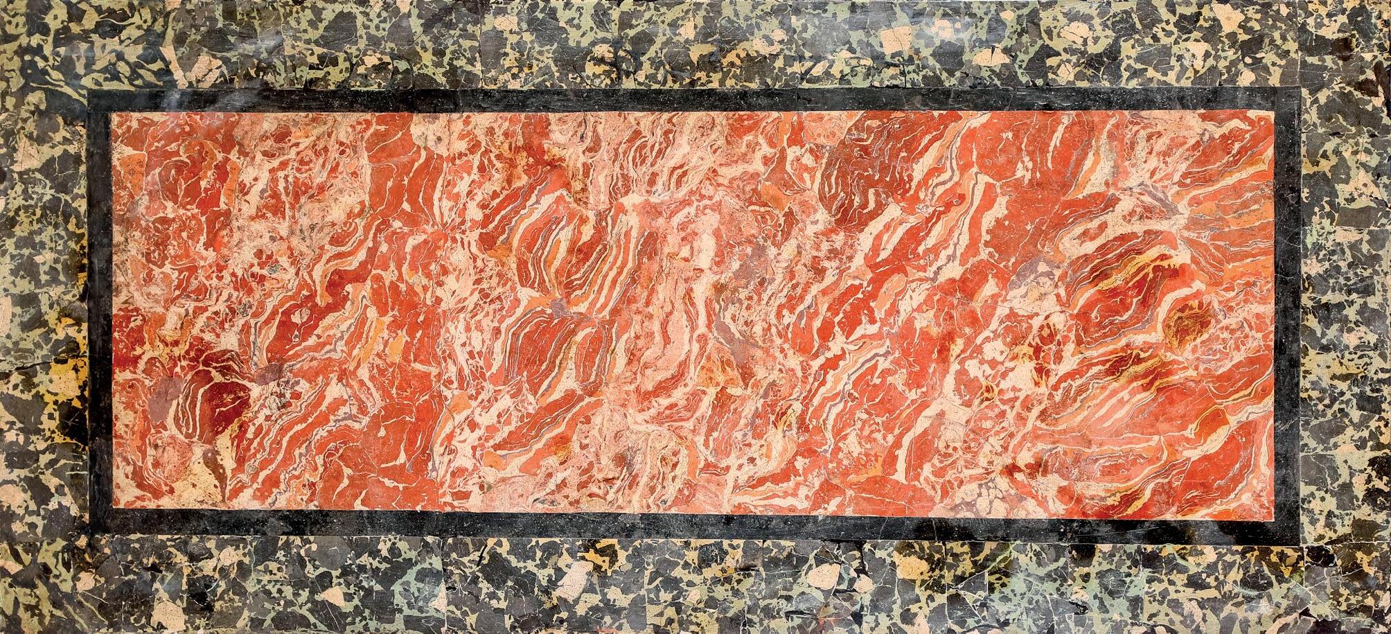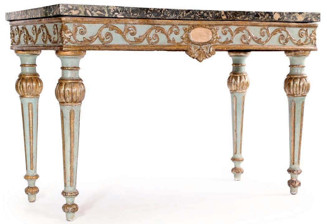 piano rettangolare in scagliola decorata ad imitazione dei marmi rosso e nero, fascia centrata da un medaglione ovale privo di ornamenti, da cui si dipartono steli curvilinei animati da rilievi vegetali. Gambe rastremate scanalate con attacchi a rocchetto su bulbo baccellato e dorato.