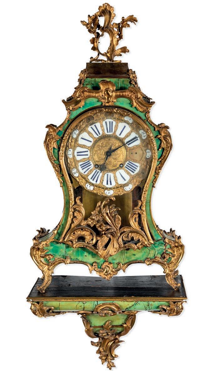 cassa sagomata con ricca ornamentazione di bronzo cesellati e dorati a volute, cartigli e motivi vegetali; quadrante con fascia oraria a numeri romani su placchette in smalto ed arabi per i minuti. Meccanica francese con scappamento modifcato ad ancora, suoneria ad ore e mezze ore, martello e cartouche assenti. Tre placchette mancanti indicanti i minuti (20, 55 e 60) cm 94x50x20 - la mensola cm 38x51x27