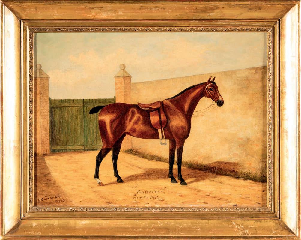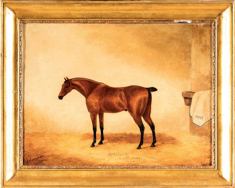 Il titolo del dipinto indica il cavallo ritratto, Cockchafer, e il suo padre, Lord Gouzh, seguendo la tradizione della genealogia ippica dell’Ottocento. Edward Garraway, con grande realismo e attenzione ai dettagli, rappresenta il cavallo come simbolo di pregio e potenza, trasformando il ritratto in una testimonianza visiva della sua linea genetica e delle origini nobili. Le iniziali HMR potrebbero indicare il proprietario o il committente dell’opera. cm 46x61,5 - con cornice cm 58x72,5