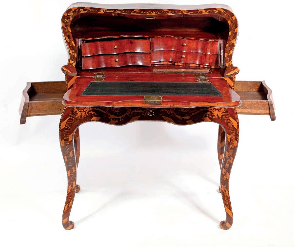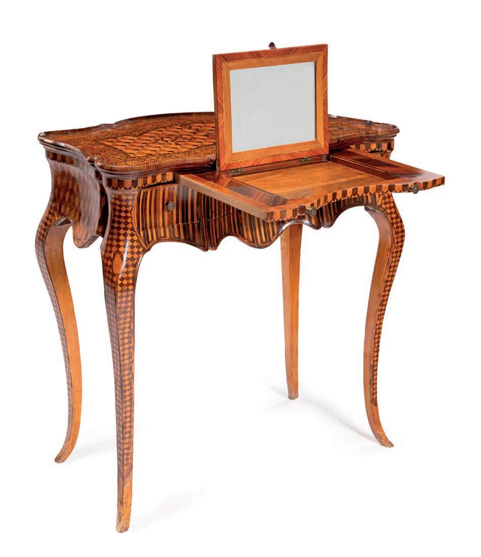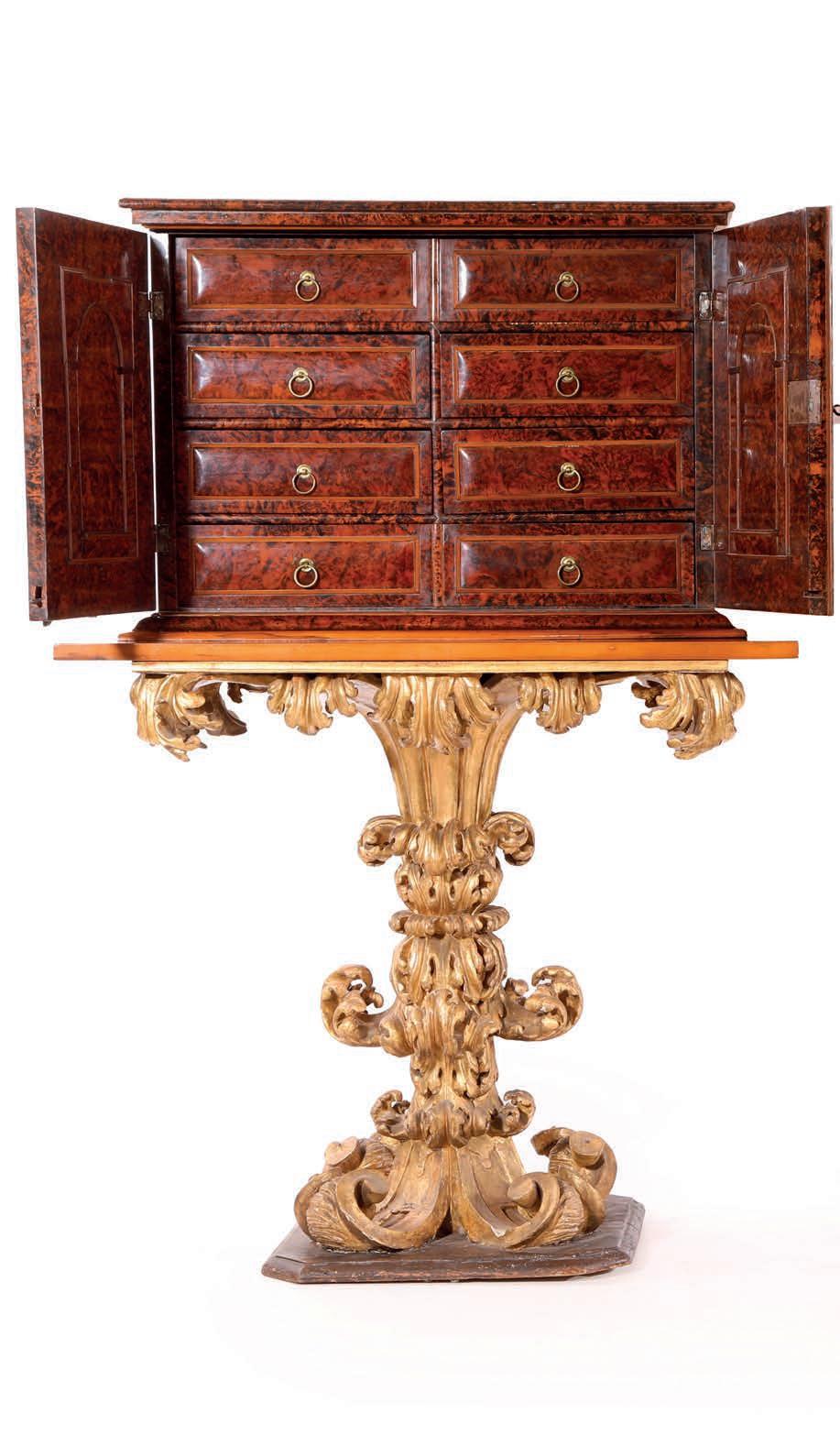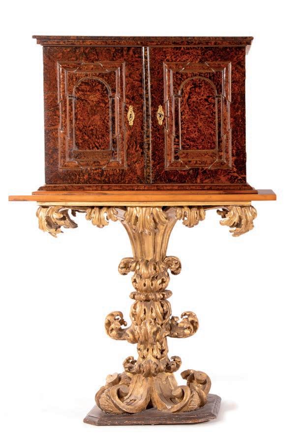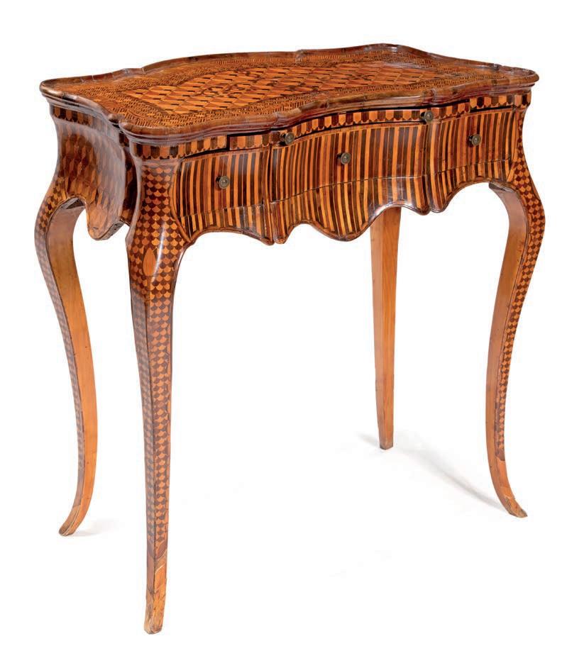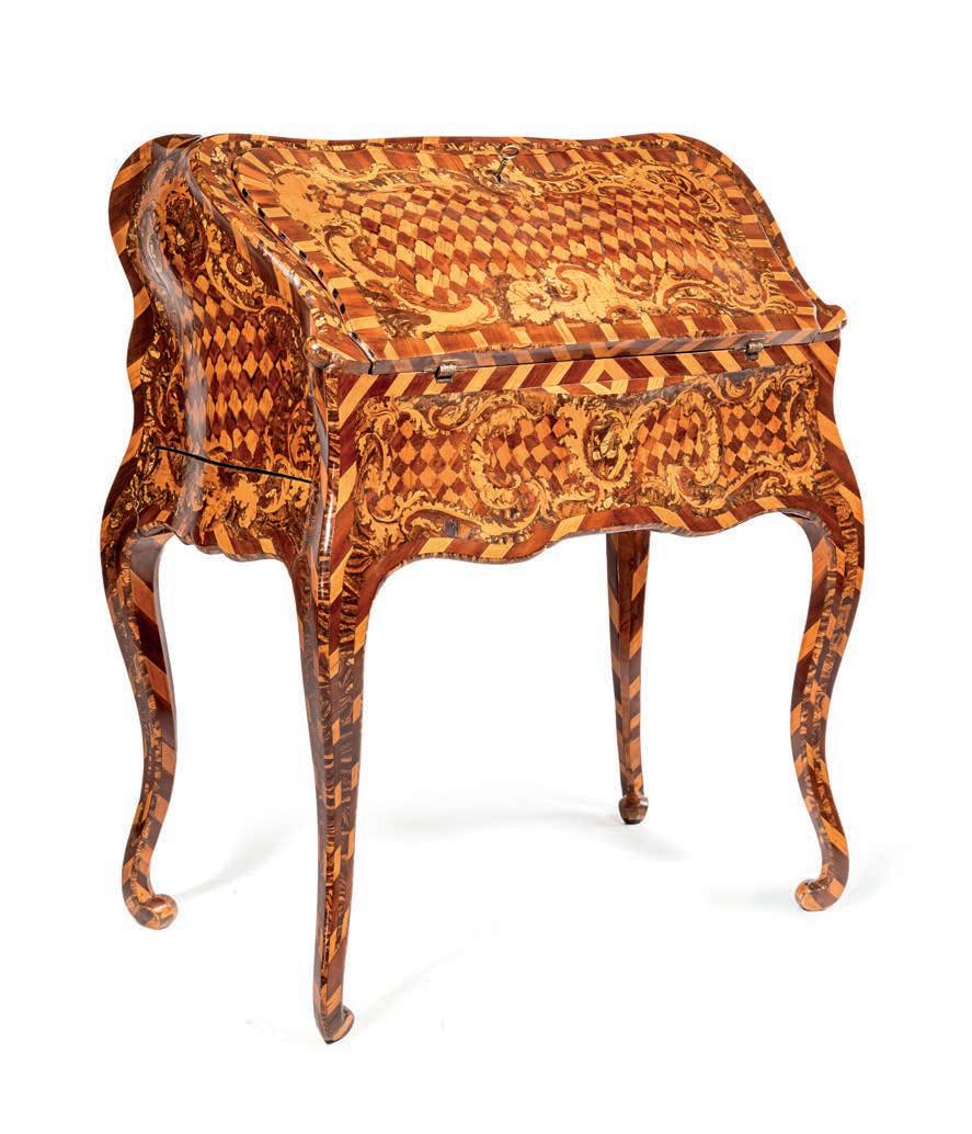 Questa raffnata coppia di cassettoni romani testimonia l’alto livello raggiunto dalla produzione ebanistica capitolina nella seconda metà del XVIII secolo, quando la pittura decorativa ad imitazione delle essenze pregiate si afferma come elegante alternativa all’impiego diretto dei legni esotici. La superfcie, dipinta a simulare il bois de rose, riproduce l’andamento della venatura e la calda tonalità rosata del legno, arricchita da riserve geometriche e flettature che scandiscono con equilibrio l’architettura del mobile. Dal punto di vista stilistico, i cassettoni si collocano nell’alveo del tardo Rococò romano con aperture verso il primo Neoclassicismo, come suggeriscono da un lato la morbidezza delle linee e il proflo mosso delle gambe, dall’altro la crescente regolarità della partitura decorativa. La scelta del bois de rose dipinto richiama modelli francesi fltrati però attraverso una sensibilità romana più misurata, nella quale la struttura architettonica prevale sull’esuberanza ornamentale. cm 86x130x65