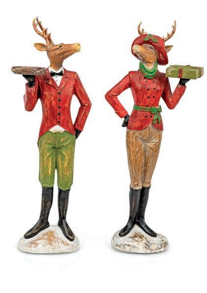 COPPIA DI FIGURE ZOOMORFE REGGICANDELA IN POLIRESINA POLICROMA (CERVI IN ABITI DA SERVITORE)