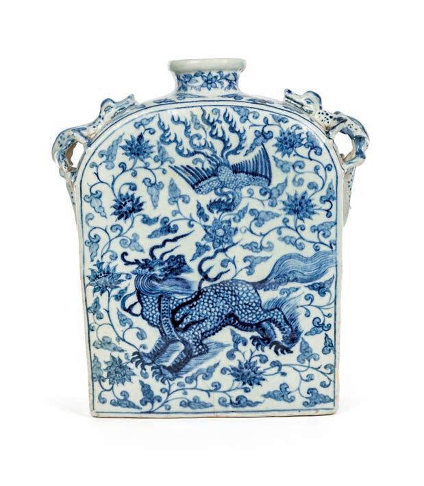 FIASCA IN PORCELLANA BIANCA E BLU, CINA, DINASTIA QING, XIX SECOLO corpo rettangolare appiattito, con spigoli superiori arrotondati sormontati da anse zoomorfe e collo cilindrico breve. La superfcie è interamente decorata in blu sotto vetrina con una ricca composizione a motivi vegetali e nuvole stilizzate secondo un repertorio iconografco tipico della produzione decorativa ottocentesca, in cui spicca un qílín colto in movimento e nella parte superiore una fenice in volo cm 30x26x8