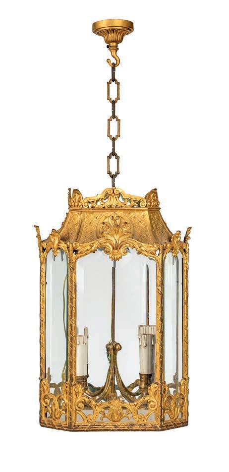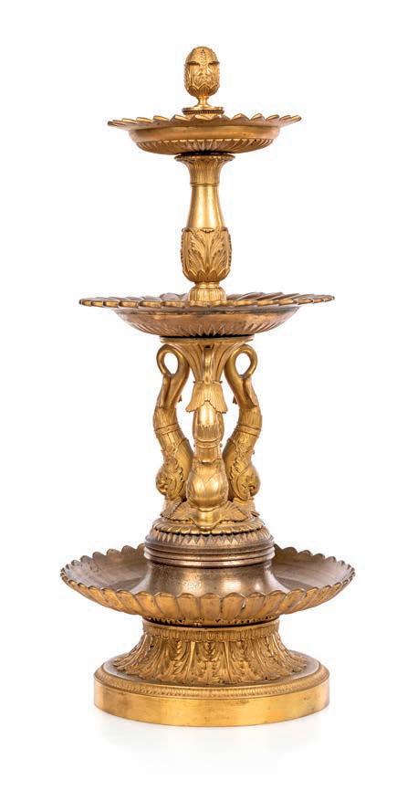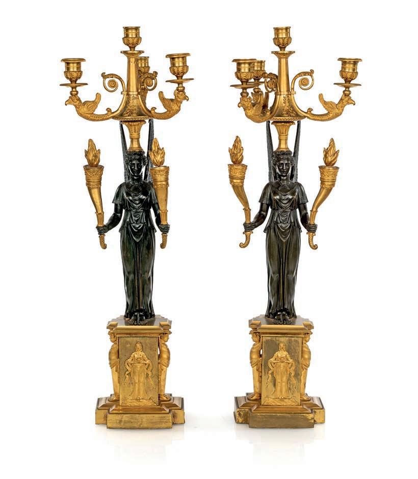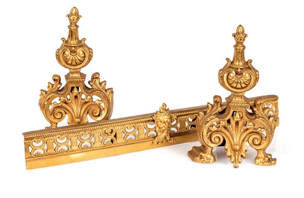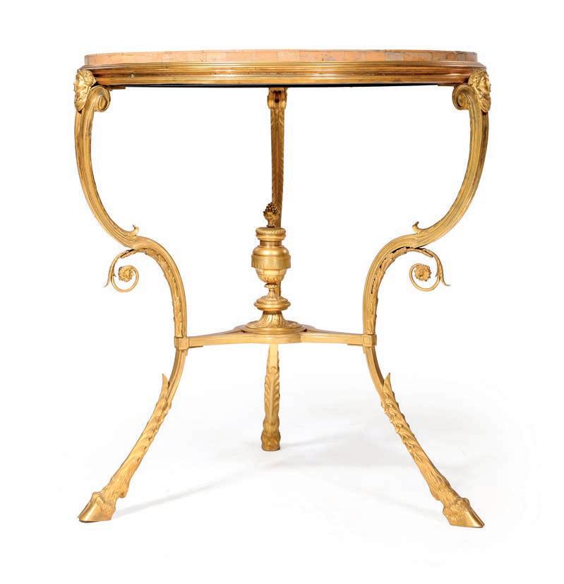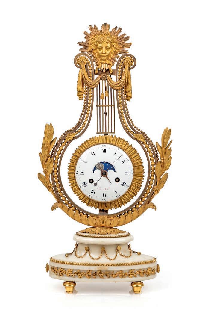 PENDOLA A LIRA BASCULANTE IN BRONZO DORATO E MARMO BIANCO, FRANCIA, LUIGI XVI La struttura a lira è defnita da montanti ornati da una teoria di perle e foglie d’alloro, simboli di gloria e armonia, che culminano nella sommità con una maschera solare raggiante, riferimento iconografco alla luce e al tempo. Il corpo centrale accoglie il quadrante circolare in smalto bianco a due fori di carica, con fasi lunari, calendario e secondi centrali, siglato A.D.F. in magenta; ghiera dentellata e meccanica francese con scappamento a caviglie. La parte inferiore è impreziosita da una ricca decorazione a foglie d’acanto e ghirlande, mentre la base presenta un fregio continuo con motivi vegetali applicati. Da revisionare cm 60x31x12